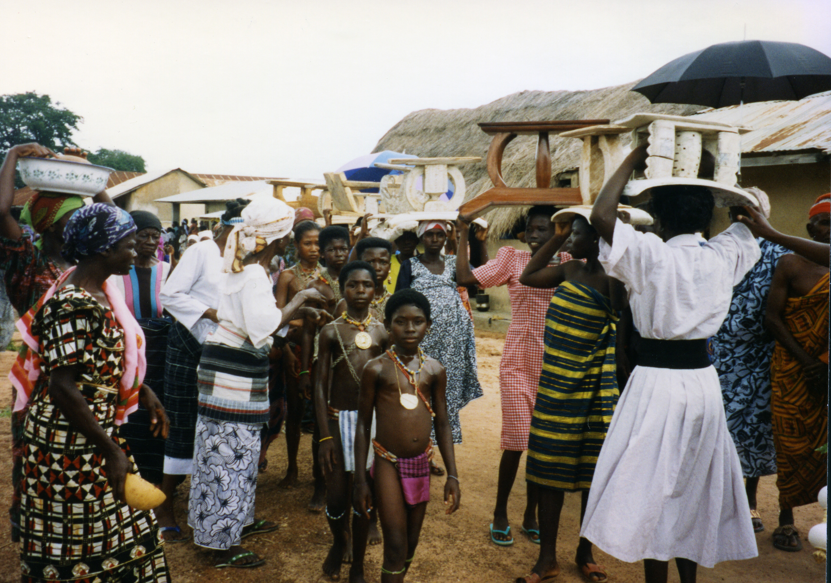 PublicYoung girls wear the sacred beads and necklaces associated with the girls' nubility rites, known in Nafaanra as Manaa Ndiom. They are dressed in Manaa Ndiom attire as part of a cultural celebration associated with the commissioning of the Banda Cultural Centre. Manaa Ndiom is a time when adolescent girls come together to learn from their female elders as they transition to womanhood. Here they walk alongside women carrying wooden stools to the Cultural Centre grounds. Adua Bedeaba leads the group as Almata follows. Ahenkro, 21 July, 1995.