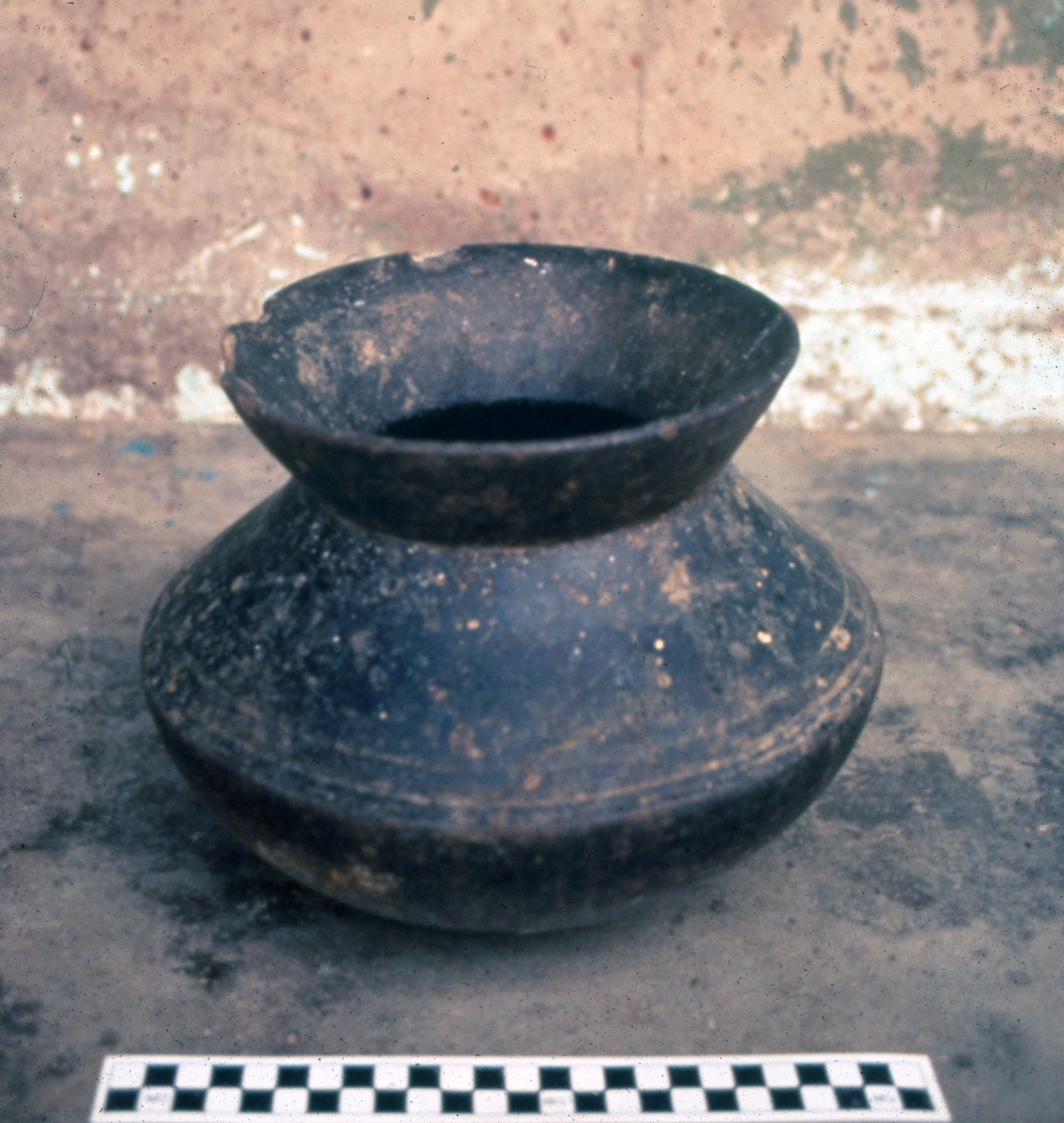 PublicSharply angled (carinated) clay pots like this one may have been used for storing liquids. Chipping around the rim of the pots suggest that this one may have been used for some time. Dorbour, 1994.