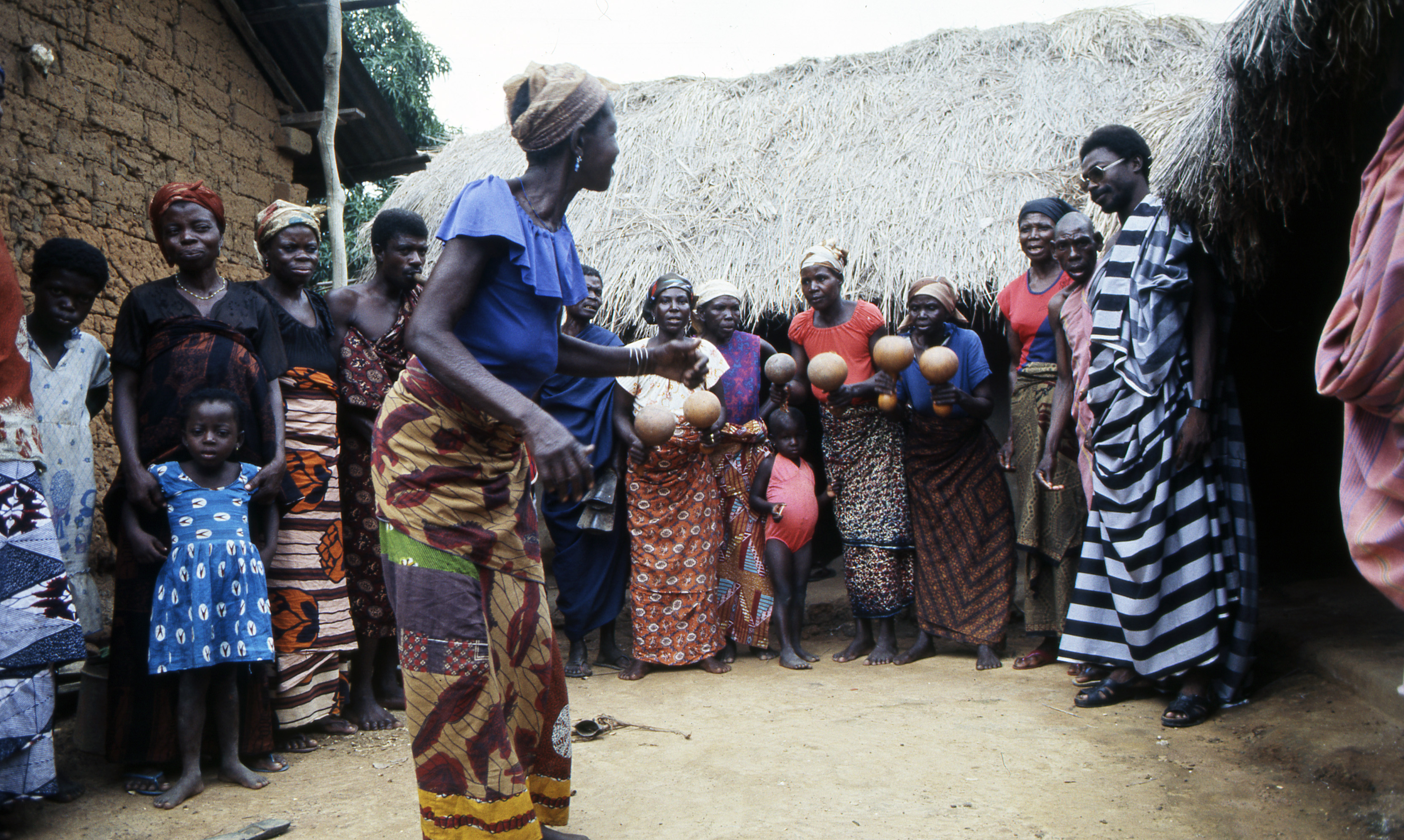 PublicGbԑԑnlԑԑ Katoo in Gbao celebrates the funeral of the caretaker of a shrine who was understood to have been killed by the 'fetish' because of harm he allegedly planned against family members. In this case, the funeral involves special forms of drumming, dancing and songs as part of a thanksgiving to the shrine. Here, Ma Millah dances, center. To the left Yaw Ble plays an antelope antler horn. Standing right, Kwame Fnaso drums. Eleven photos. Gbao, 8 August, 1986.