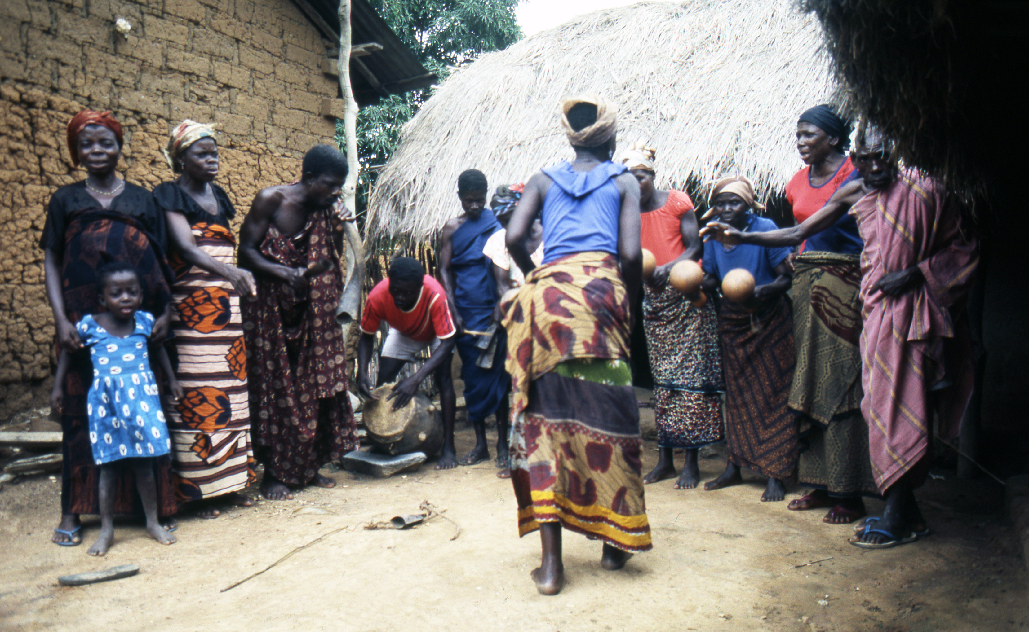 Gbԑԑnlԑԑ Katoo in Gbao celebrates the funeral of the caretaker of a shrine who was understood to have been killed by the 'fetish' because of harm he allegedly planned against family members. In this case, the funeral involves special forms of drumming, dancing and songs as part of a thanksgiving to the shrine. Here, Ma Millah dances, center. To the left Yaw Ble plays an antelope antler horn. Standing right, Kwame Fnaso drums. Eleven photos. Gbao, 8 August, 1986.