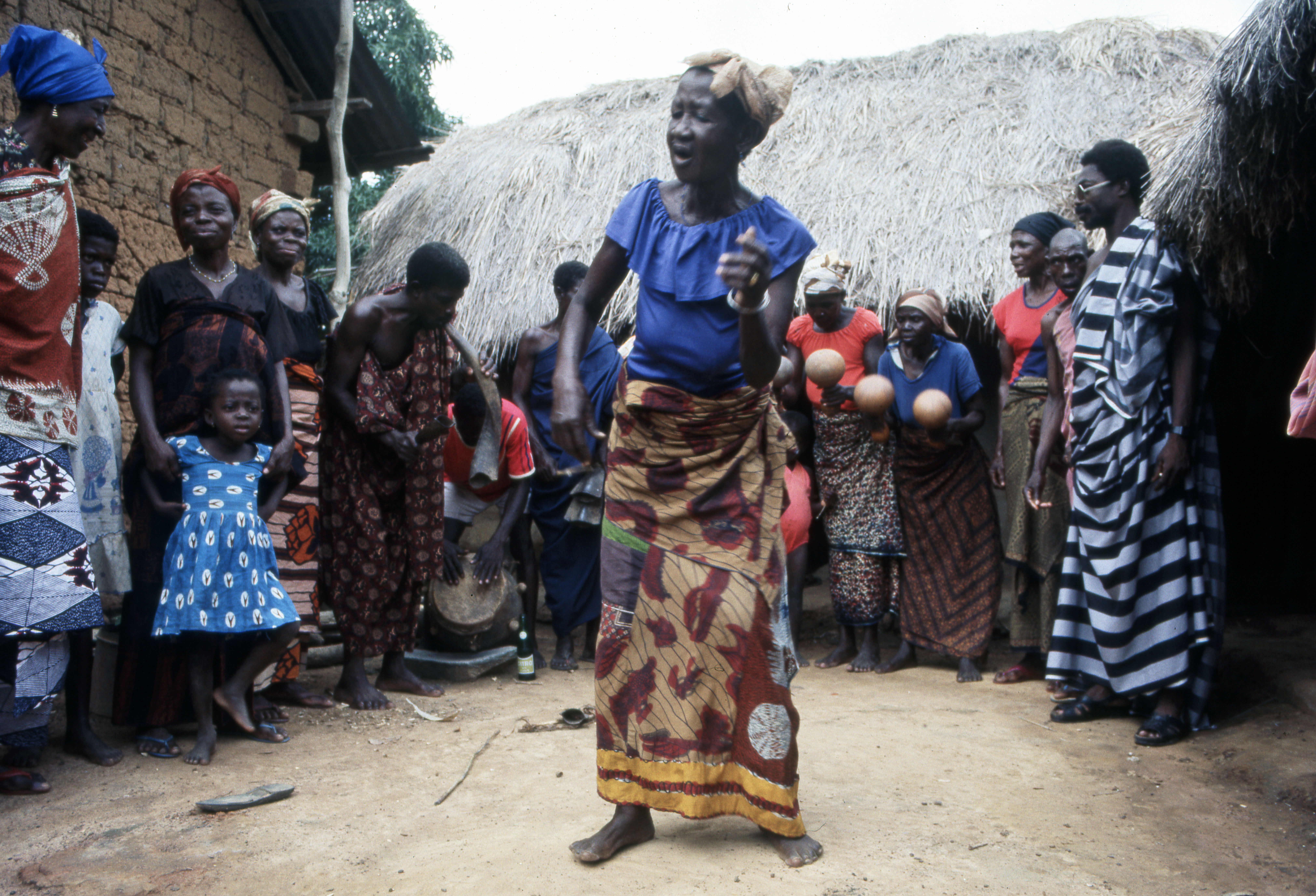 PublicGbԑԑnlԑԑ Katoo in Gbao celebrates the funeral of the caretaker of a shrine who was understood to have been killed by the 'fetish' because of harm he allegedly planned against family members. In this case, the funeral involves special forms of drumming, dancing and songs as part of a thanksgiving to the shrine. Here, Ma Millah dances, center. To the left Yaw Ble plays an antelope antler horn. Standing right, Kwame Fnaso drums. Eleven photos. Gbao, 8 August, 1986.