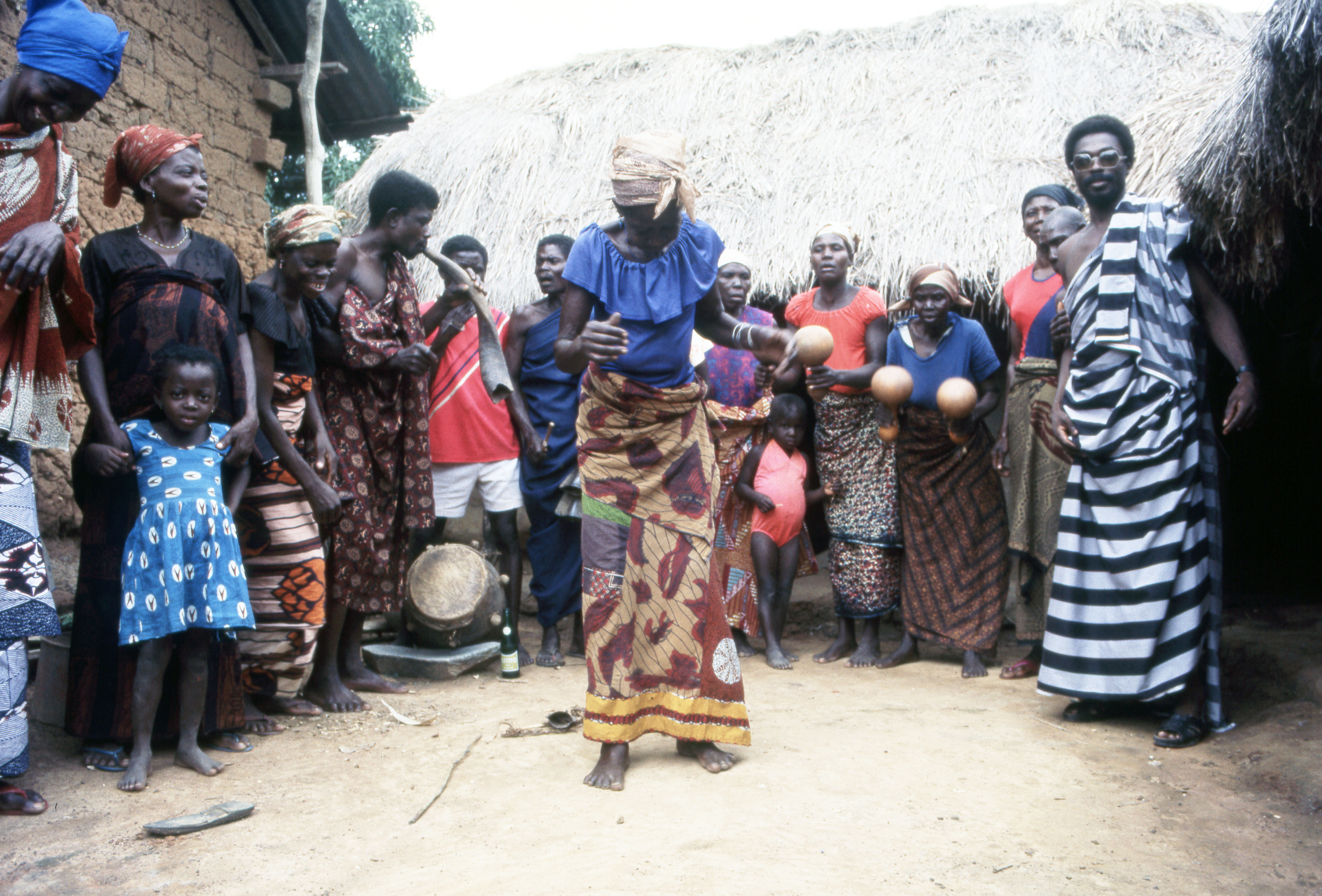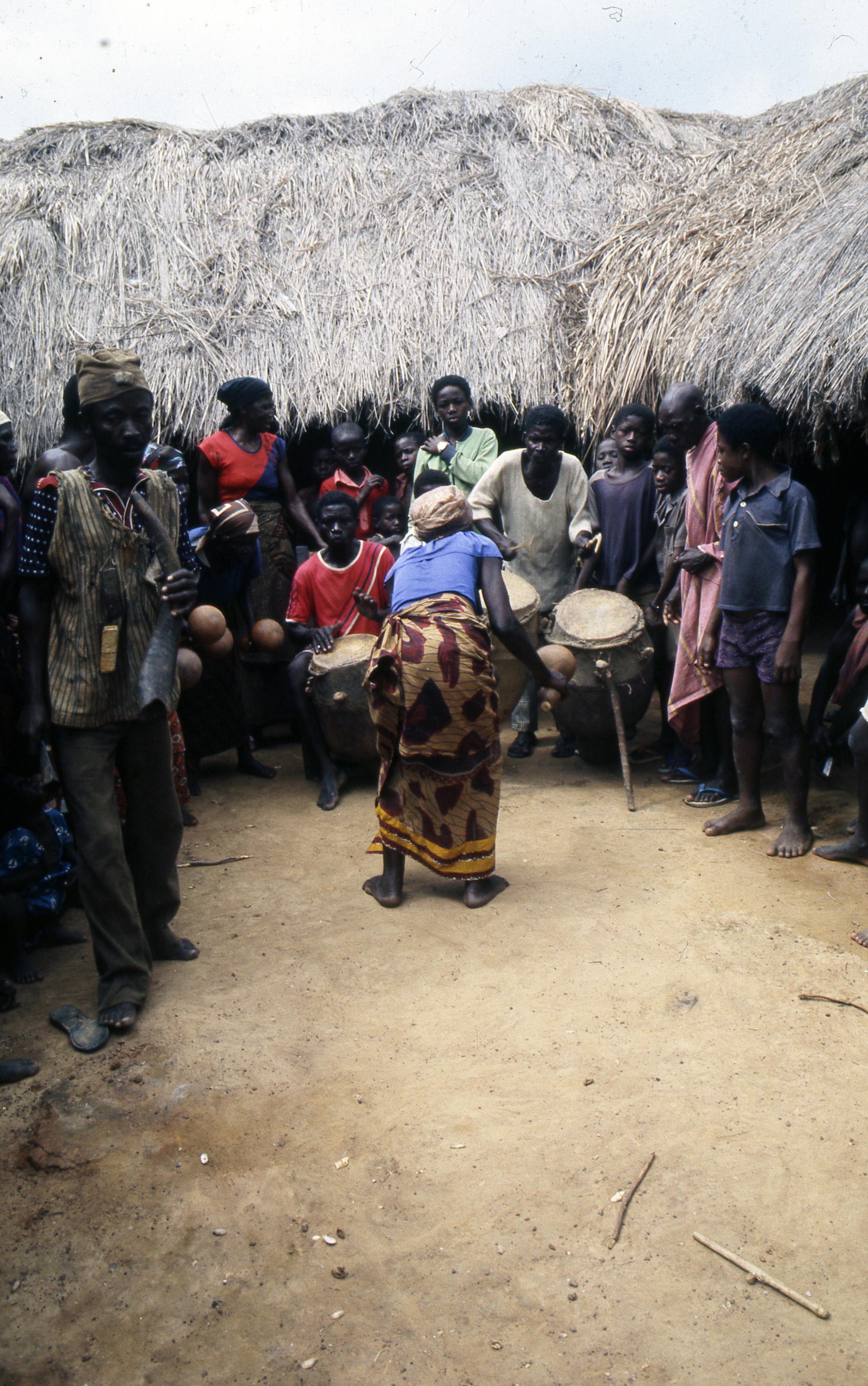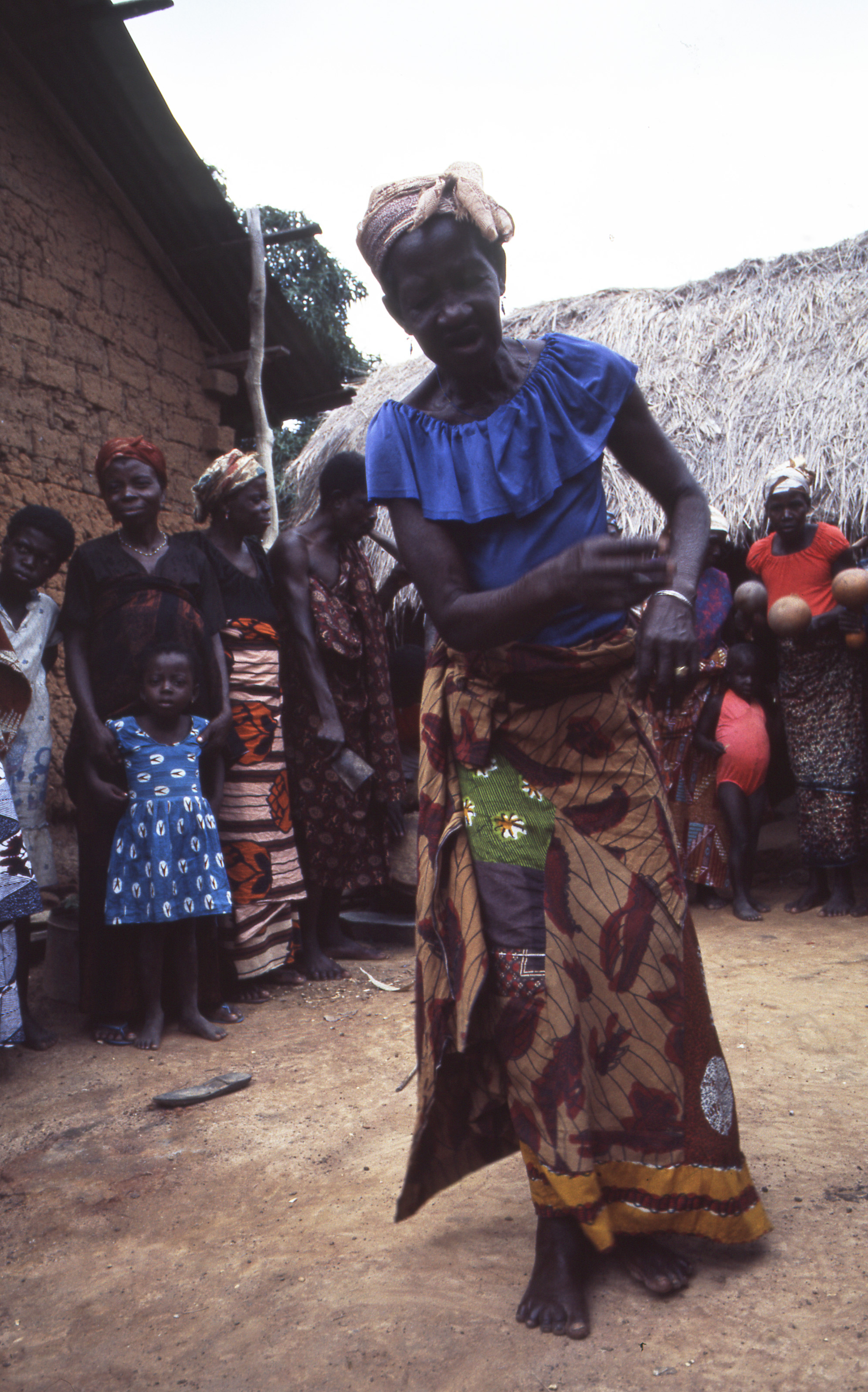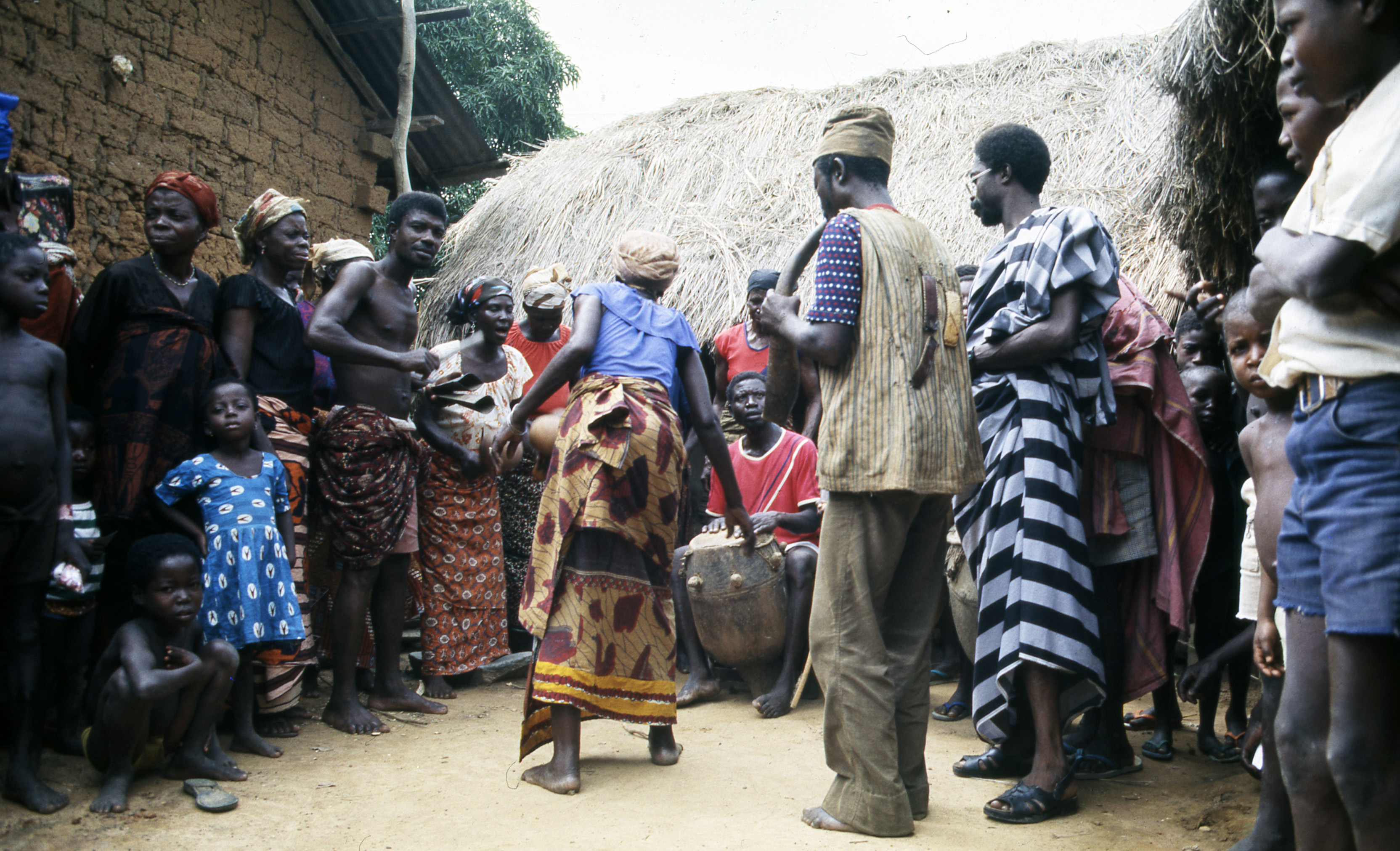 PublicGbԑԑnlԑԑ Katoo in Gbao celebrates the funeral of the caretaker of a shrine who was understood to have been killed by the 'fetish' because of harm he allegedly planned against family members. In this case, the funeral involves special forms of drumming, dancing and songs as part of a thanksgiving to the shrine. Here, Ma Millah dances, center. To the left Yaw Ble plays an antelope antler horn. Standing right, Kwame Fnaso drums. Eleven photos. Gbao, 8 August, 1986.