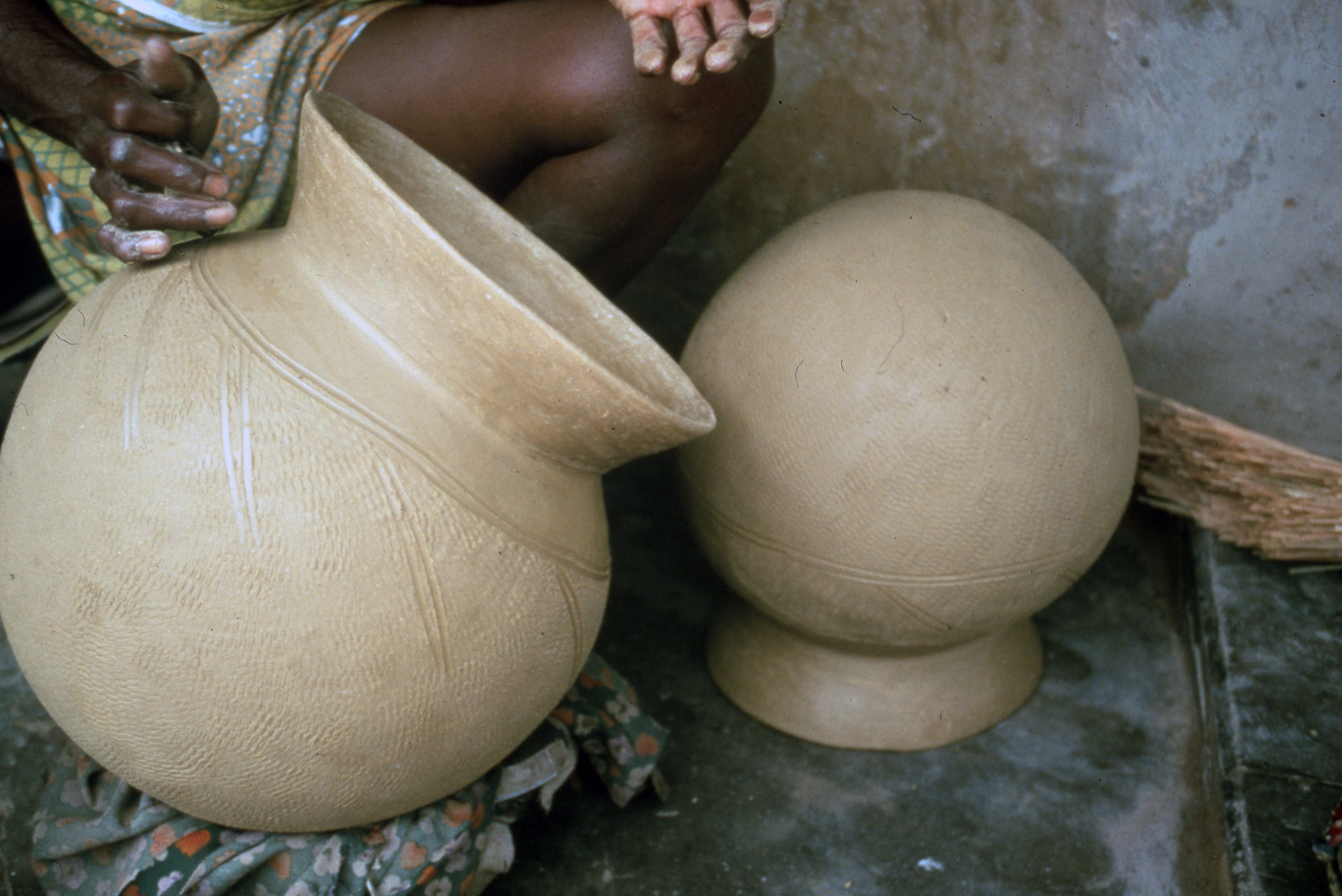 PublicA potter completes decorations on a clay cooking pot (sro chͻ in Nafaanra). Another pot sits nearby, turned upside down. The lower bodies of the pots have been surface treated by rolling a maize cob (bledjukaan in Nafaanra) across the leather-dry surface of the clay jar. Shallow grooved lines have been etched over top. The clay jars are now ready to be fired. Dorbour, 1994.