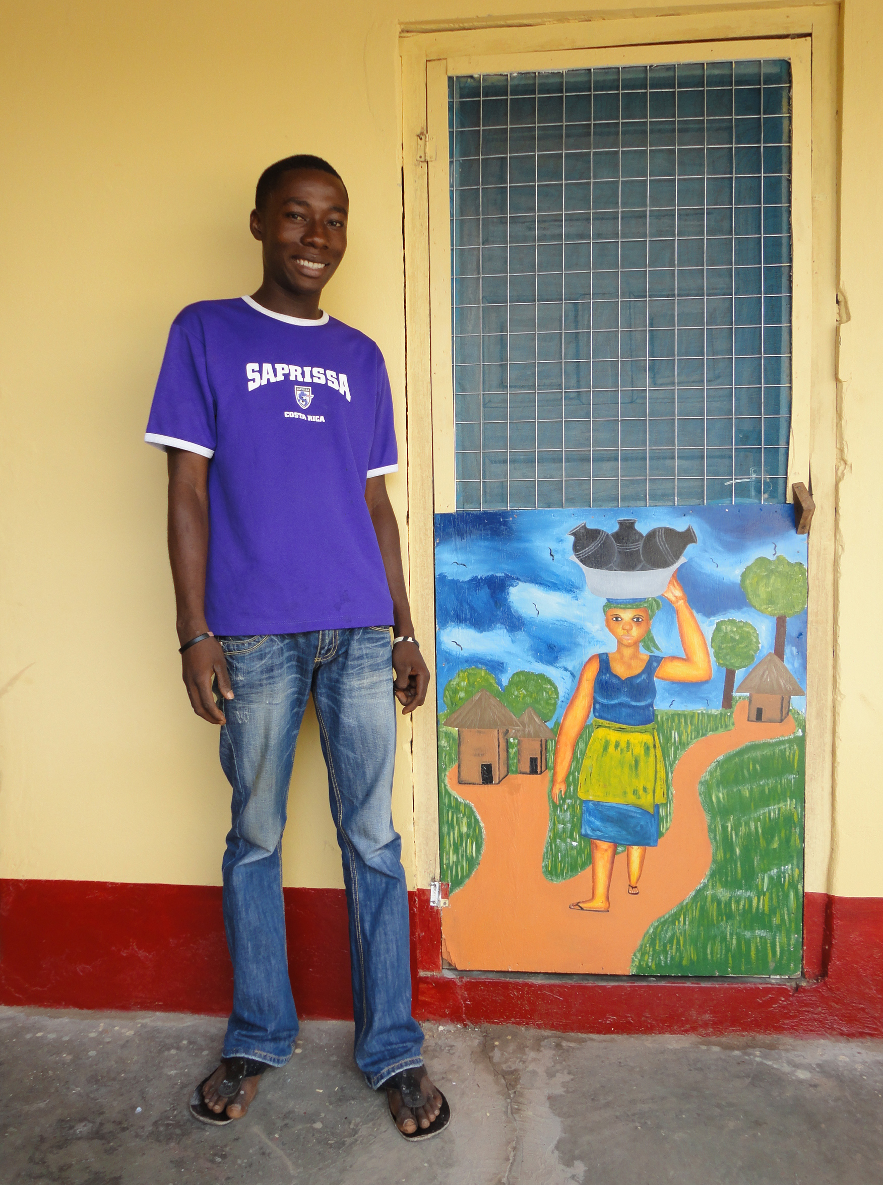 Public DepositedIn June 2011, Banda Research Project team member Amanda Logan collaborated with local artist Kwame K.B. 2 to develop paintings for the Banda Cultural Centre's courtyard doors. The paintings illustrate handicrafts practiced in the area for which we have archaeological evidence. Here Kwame K.B. 2 stands next to his painting of a woman carrying pottery to market. Ahenkro, 8 June, 2011.