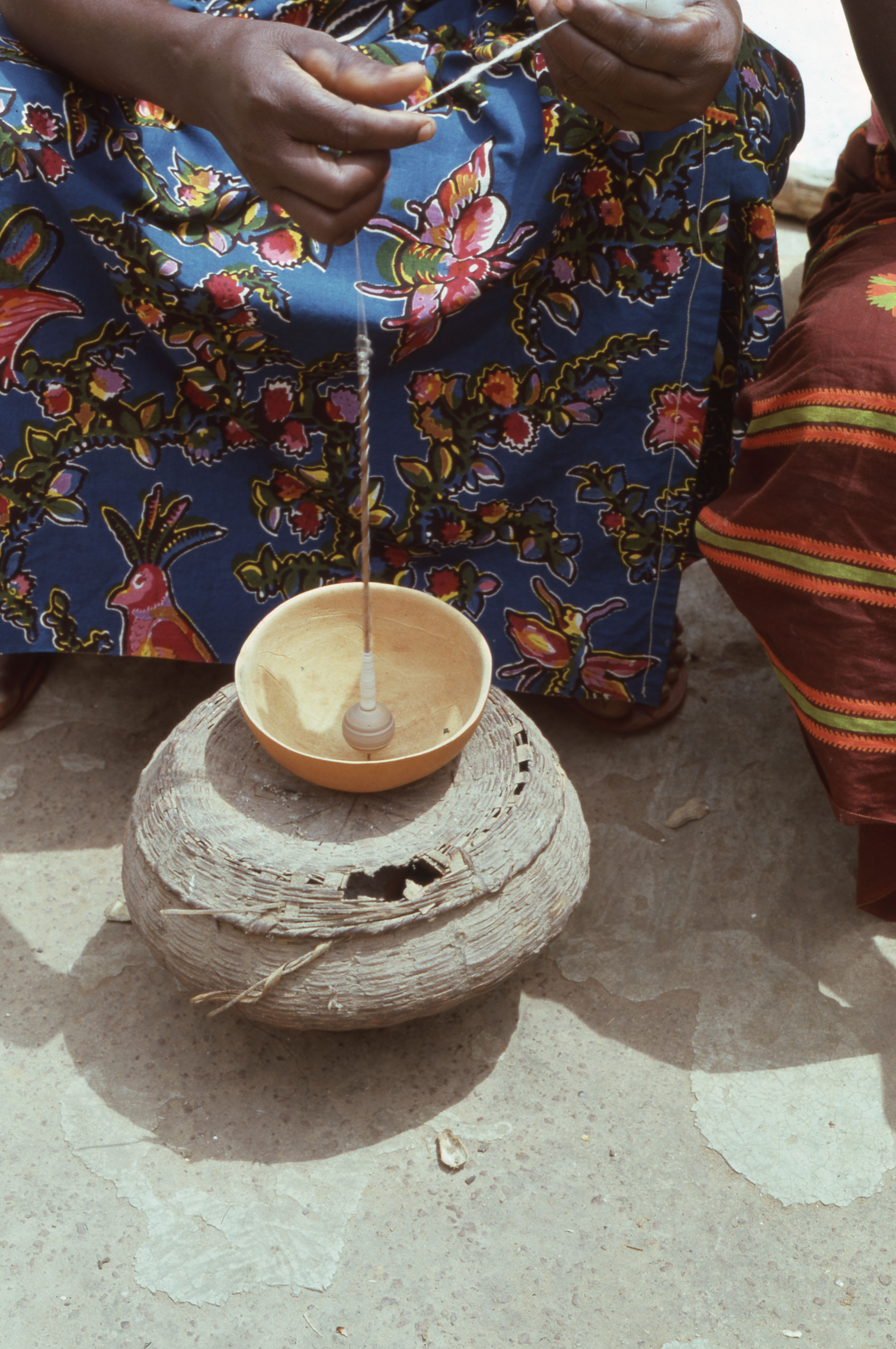 Ma Fiԑn of Gbao (left) and Abena Wusu of Dompofie (right) spin cotton thread. Their spindles (gԑndԑ in Nafaanra) are weighted by fired clay spindle whorls (gԑndԑ kaan in Nafaanra) which help the spindle to maintain an even spin. Ma Fiԑn uses a calabash bowl as a spinning surface. Abena Wusu uses an enamel-ware bowl placed on a basket. They use their right hand to guide thread onto the spindle as it spins. In their left hand they hold the raw cotton from which the thread is being spun. They control the tension and flow of the cotton by alternately pulling back and easing their left hands. Thread forms as the spindle spins, with the finished product building up in layers toward the spindle's lower end, near the whorl. The baskets on top of which they spin used to store spinning equipment when not in use. Until recent decades, spinning was a routine household activity for women who then gave thread to men skilled in weaving to make cloth for the household. Spindle whorls found on archaeological sites dating to the late 18th and 19th centuries tell us that spinning was also a household activity during those centuries. In the photo's background harvested foods are drying (groundnut, cassava, chili pepper). A large basket and other containers (including a plastic tub) sit next to dried calabash ready to be sent to market. To the right, a clay water pot (chͻkoo in Nafaanra) rests on a metal basin and in the top right is a metal water barrel. Four photos. Gbao, September, 1982.