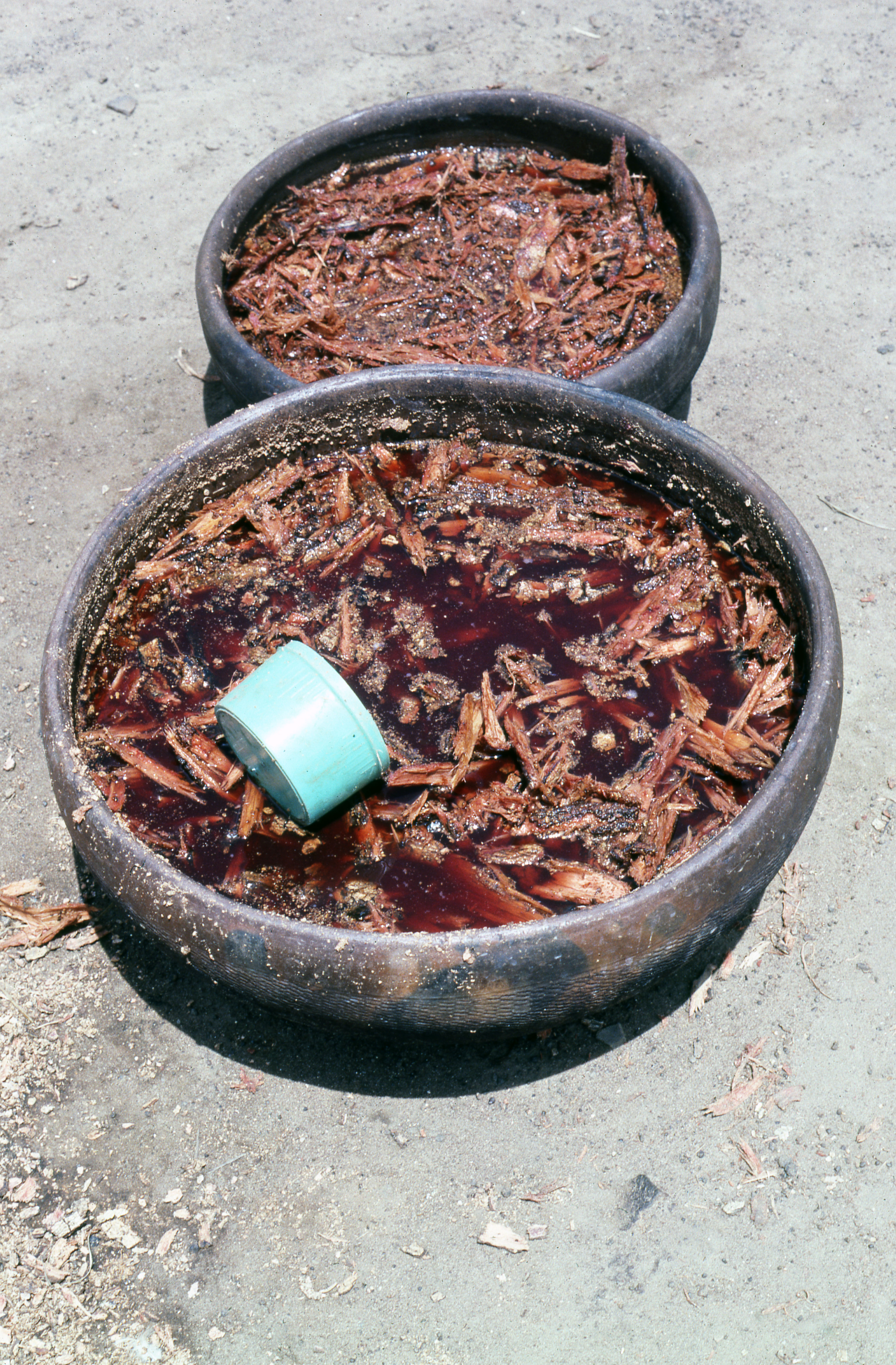 PublicPotters place the pounded bark of specific trees (surom, layene, koko or lakroas they are known in Nafaanra) in water to create a solution used to finish pots. The red-colored solution carbonizes on the surface of hot pots just removed from the bonfire. Here, the prepared solution awaits as the pots are being fired. A plastic container floats on the surface. Bondakile, October, 1982.