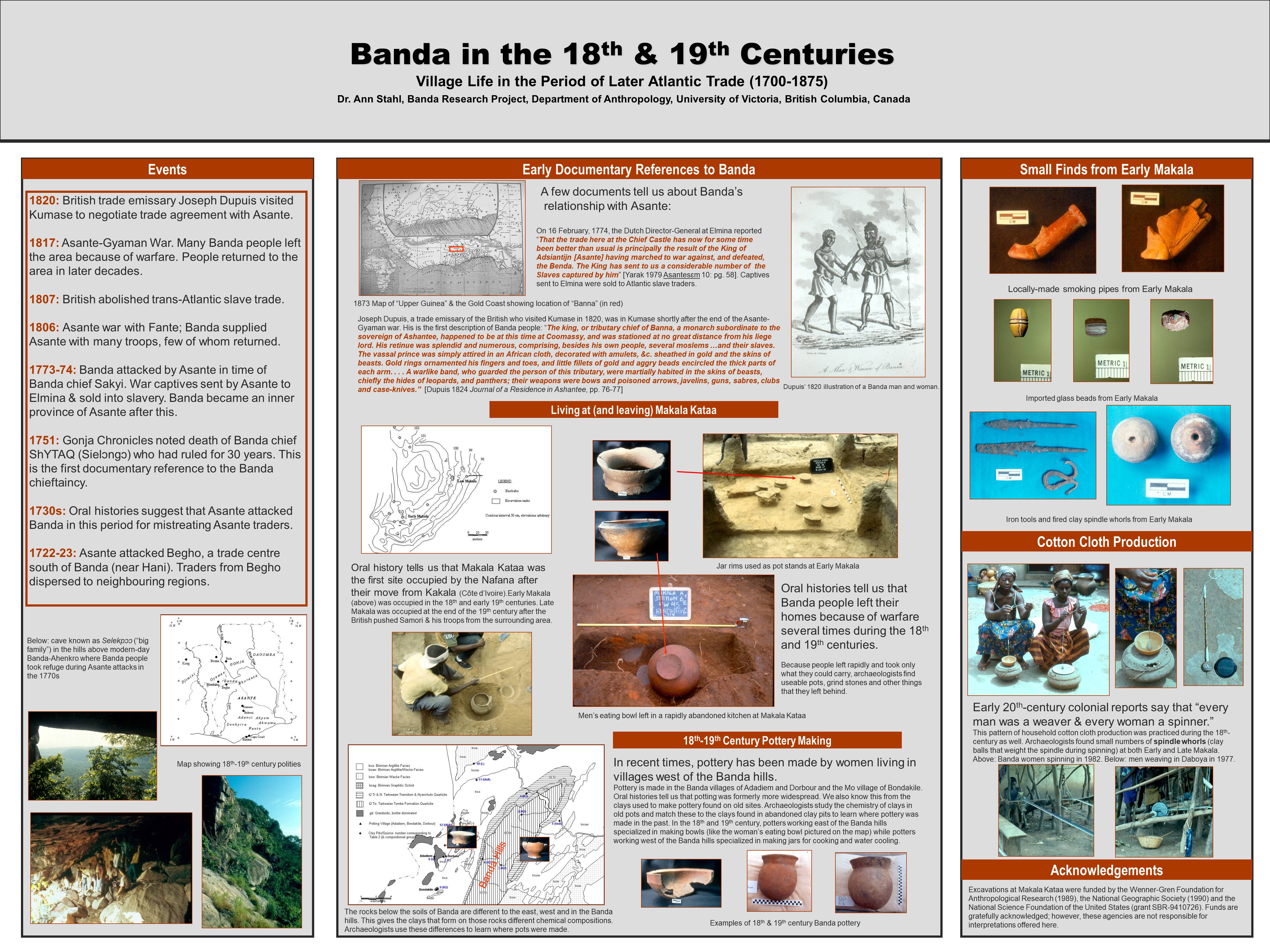 Public DepositedAn educational poster with pictures and text which describes Banda-area village life during the 18th and 19th centuries based on oral histories, written sources and archaeology. It describes early written references to Banda and briefly summarizes what has been learned about handicrafts like potting and cloth-making based on archaeological excavations at Makala Kataa. It is one of five posters prepared for a Banda community event held in July, 2011. Printed versions of the posters are housed in the Banda Cultural Centre, Ahenkro.