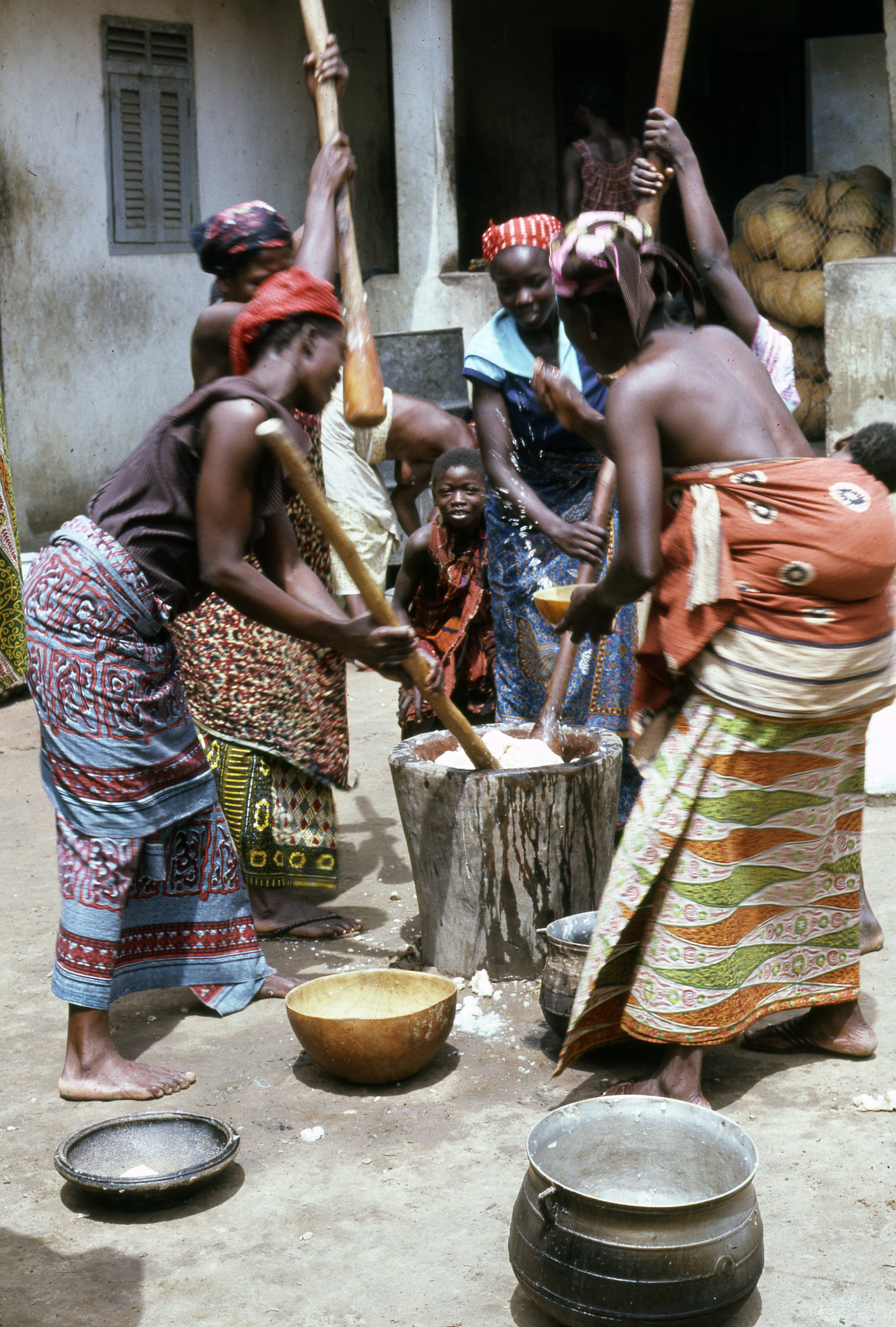 The New Yam Festival (Finjie Lie in Nafaanra) marks the day when people can begin to eat the new crop of yams (finyjie in Nafaanra). Here women gather round a wooden mortar to pound cooked yam tubers to make fufu. Women pound with heavy, round-ended pestles. Working together, they use their pestles to pound and turn the fufu. Pestles hit the mortar's edge as they pound, creating a rhythmic accompaniment to their work. The musical sound of women and their helpers pounding fufu or grain was an integral part of the soundscape of village life in the earlier times. To the rear (right) calabashes (gourds, chrԑ in Nafaanra) wrapped in netting are ready to be sent to market. To the front sits a pottery grinding bowl (left), a calabash (center) and metal cooking pots (right). Ahenkro, 30 August, 1982.