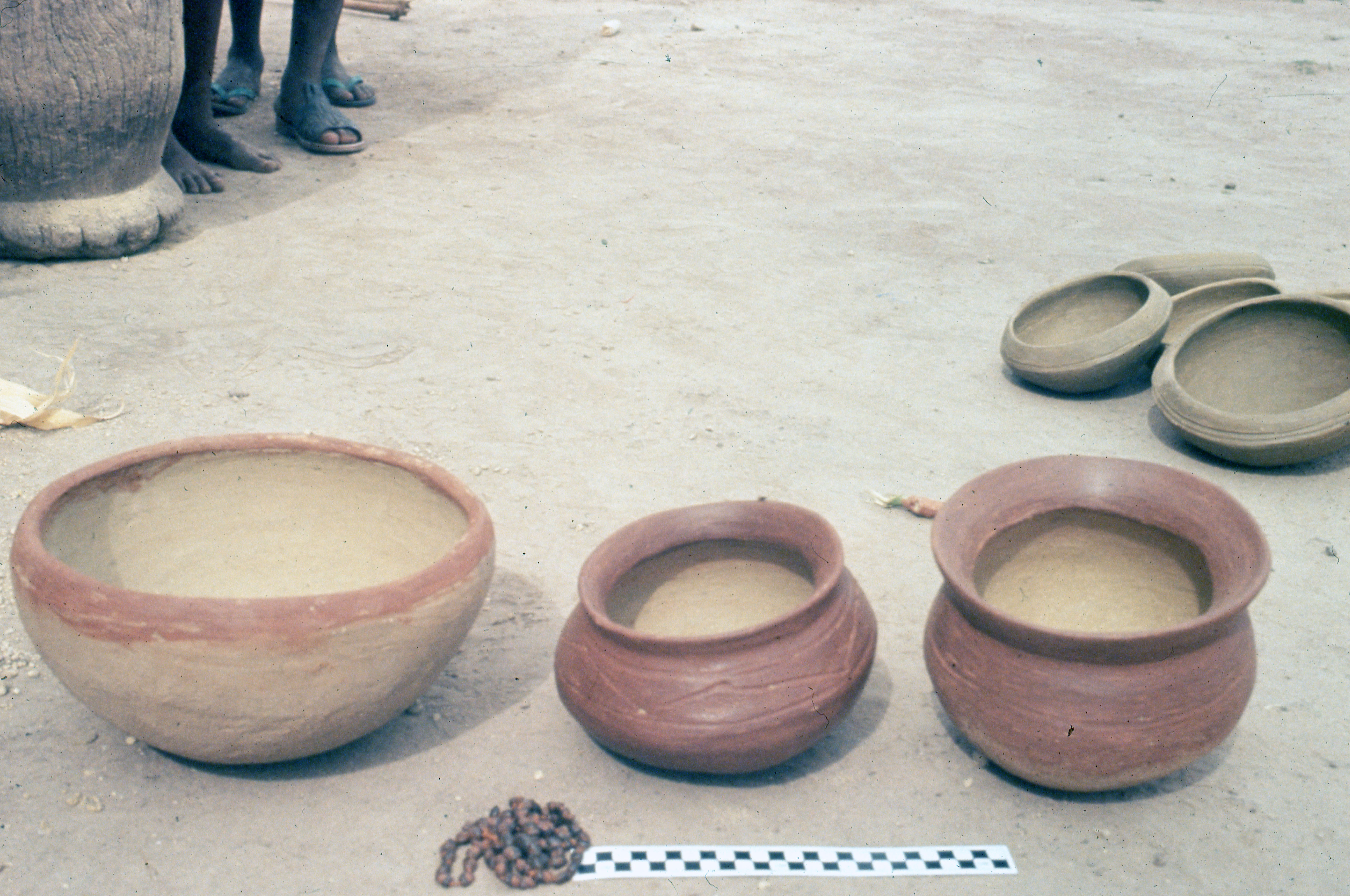 PublicA group of unfired clay pots to which red slip (chuma in Nafaanra) has been applied prior to firing. The string of Babobab tree seeds (foreground) is used to burnish the slip. By rubbing the dried slip vigorously with the seeds, the slip adheres to the surface and becomes shiny. To the right rear are several unfired clay eating bowls (kpokpoo in Nafaanra). Dorbour, 1994.
