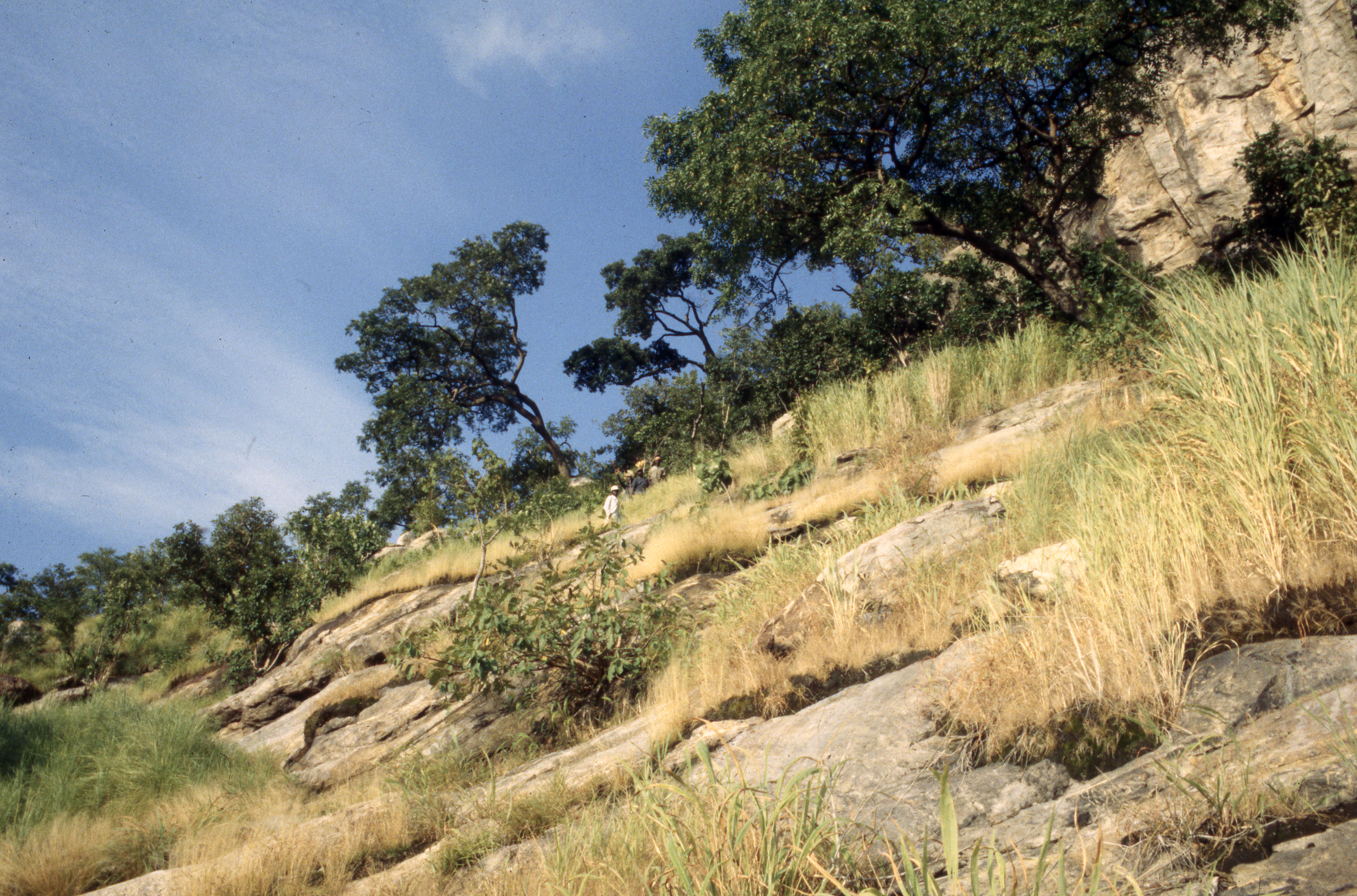 PublicThe cliff face of the of the Banda rockshelter (upper right) gives way to a rocky slope below which is partially covered in low-growing grass. View to the north. Banda hills, 30 July, 1994.