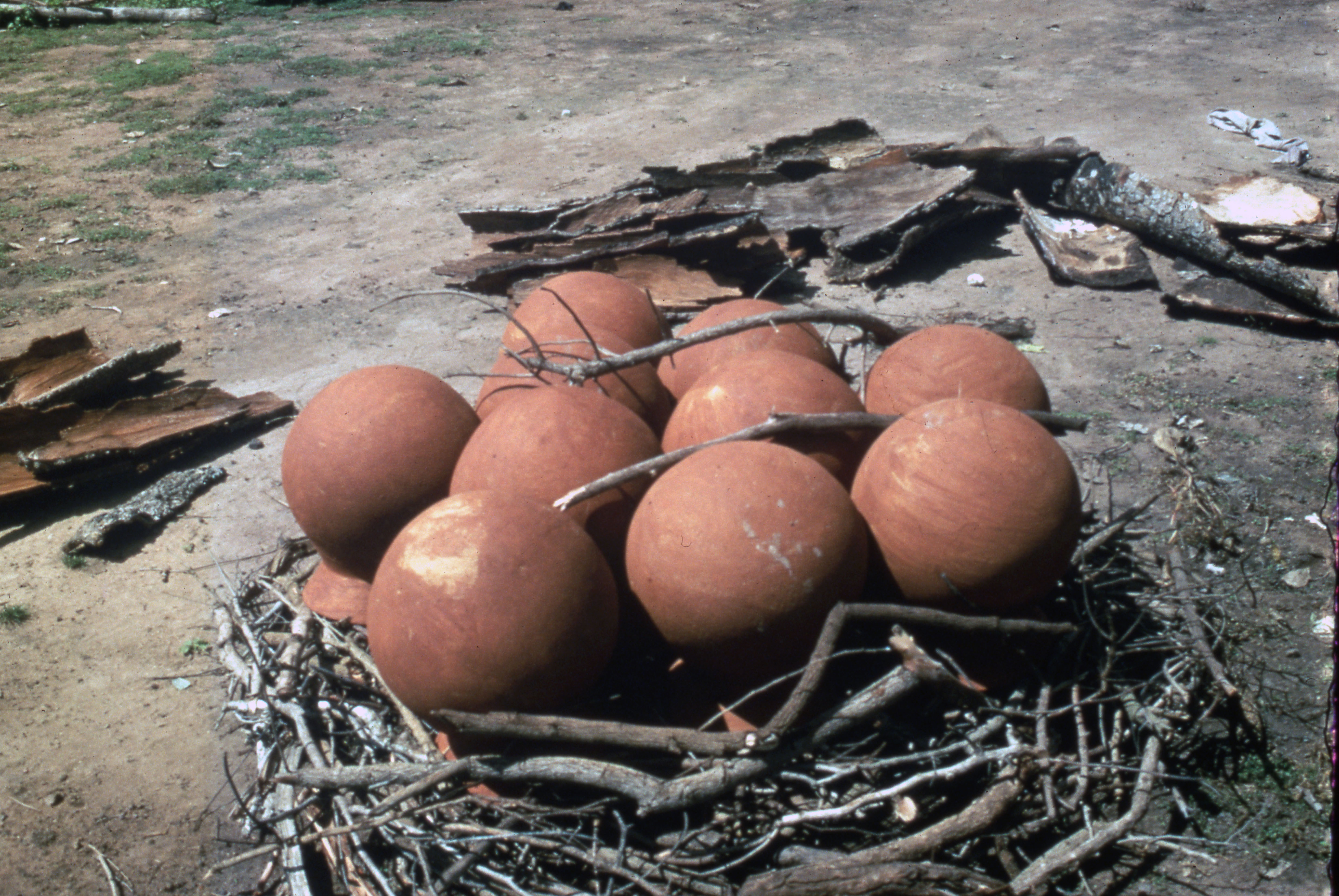 PublicTen clay cooking pots (sro chͻ in Nafaanra) have been placed upside down on a bed of firewood in preparation for a bonfire that will fire the clay pots. These pots have been red-slipped (chuma in Nafaanra) before firing. In the background is the bark that will be used to cover and surround the pottery before the bonfire is lit. Once lit, the fire burns for beween 30 minutes and an hour, after which the clay jars will be useable and ready for sale. Dorbour, 1994.