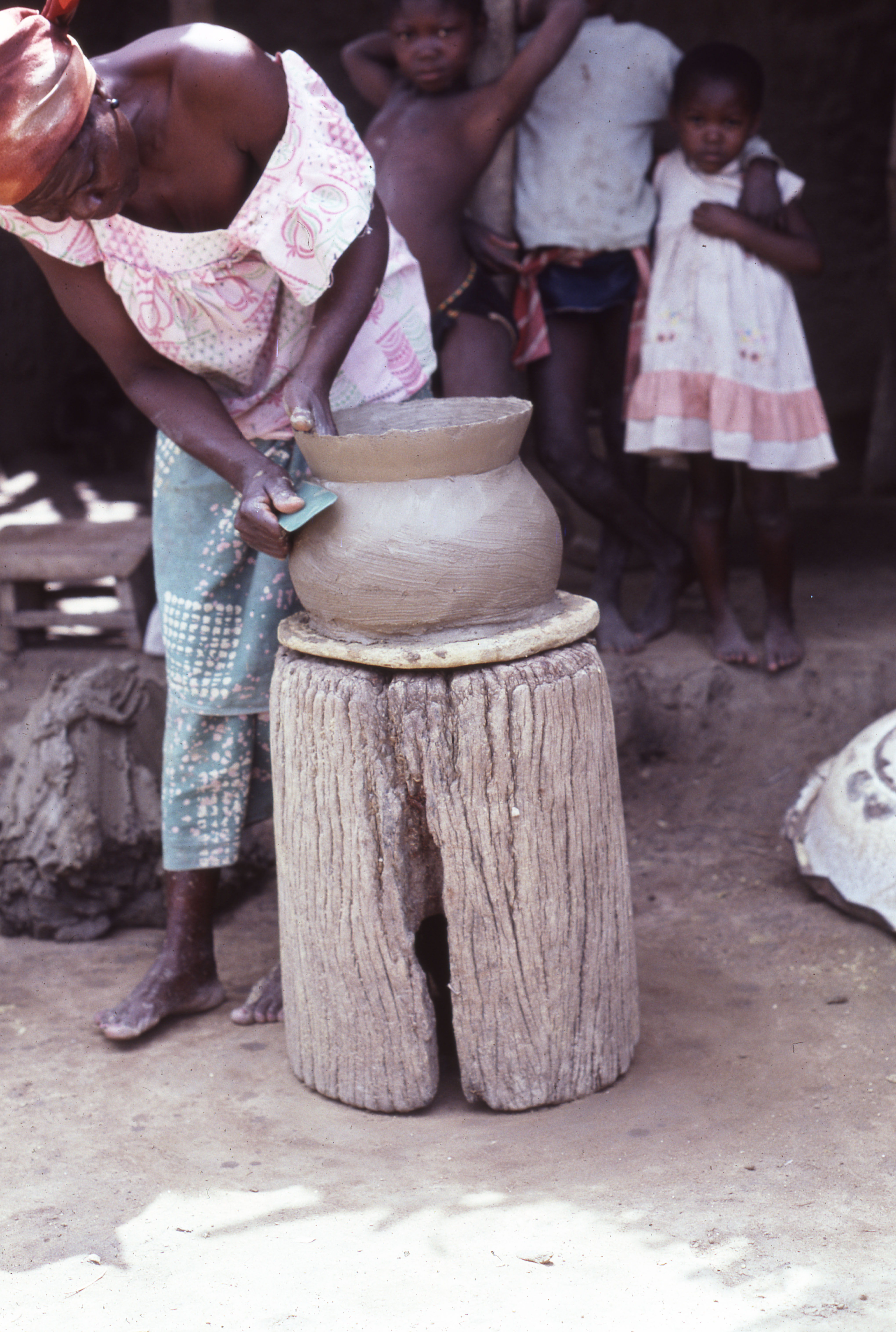 PublicA standing potter molds the body of a clay jar using a draw-and-drag (direct pull) technique. Here she uses a flat metal spatula to smooth the now-formed jar's exterior surface. She places the edge of her tool at the neck and makes downward strokes to create a smooth surface on the moist clay. As she works, she moves around the stump that supports the palette (kpankpa in Nafaanra) on which the jar is being formed. Bondakile, October, 1982.