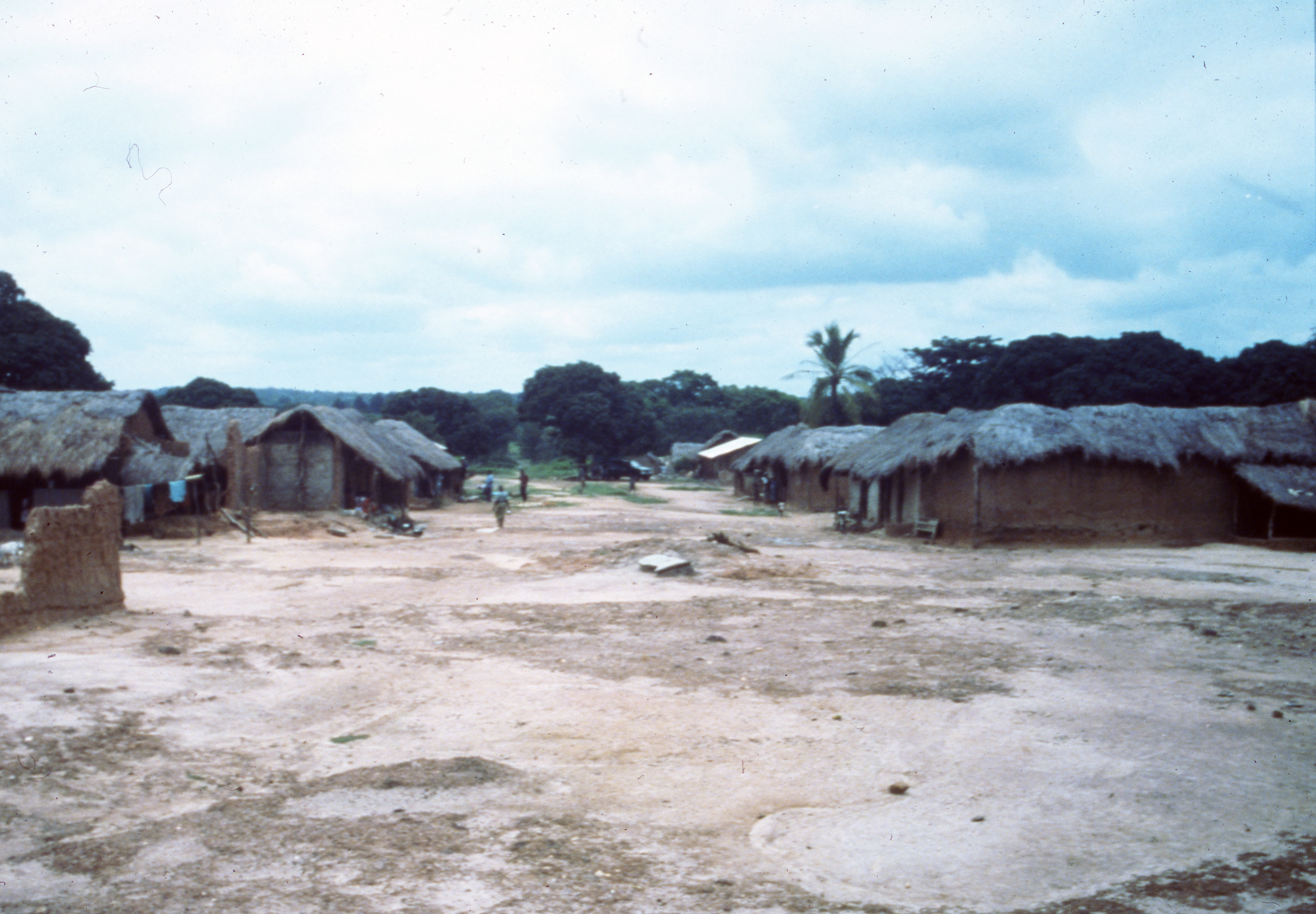 PublicA view of Makala's wide main street, standing at the west edge of town, looking eastward. A mango tree grows in the street at the far end of the street. Atakpame (coursed earthen-walled) houses with thatched roofs line the street. A single house with a metal roof is visible to the right of the mango tree. The streets and areas around houses are kept clear of plants. Makala, July, 1994.