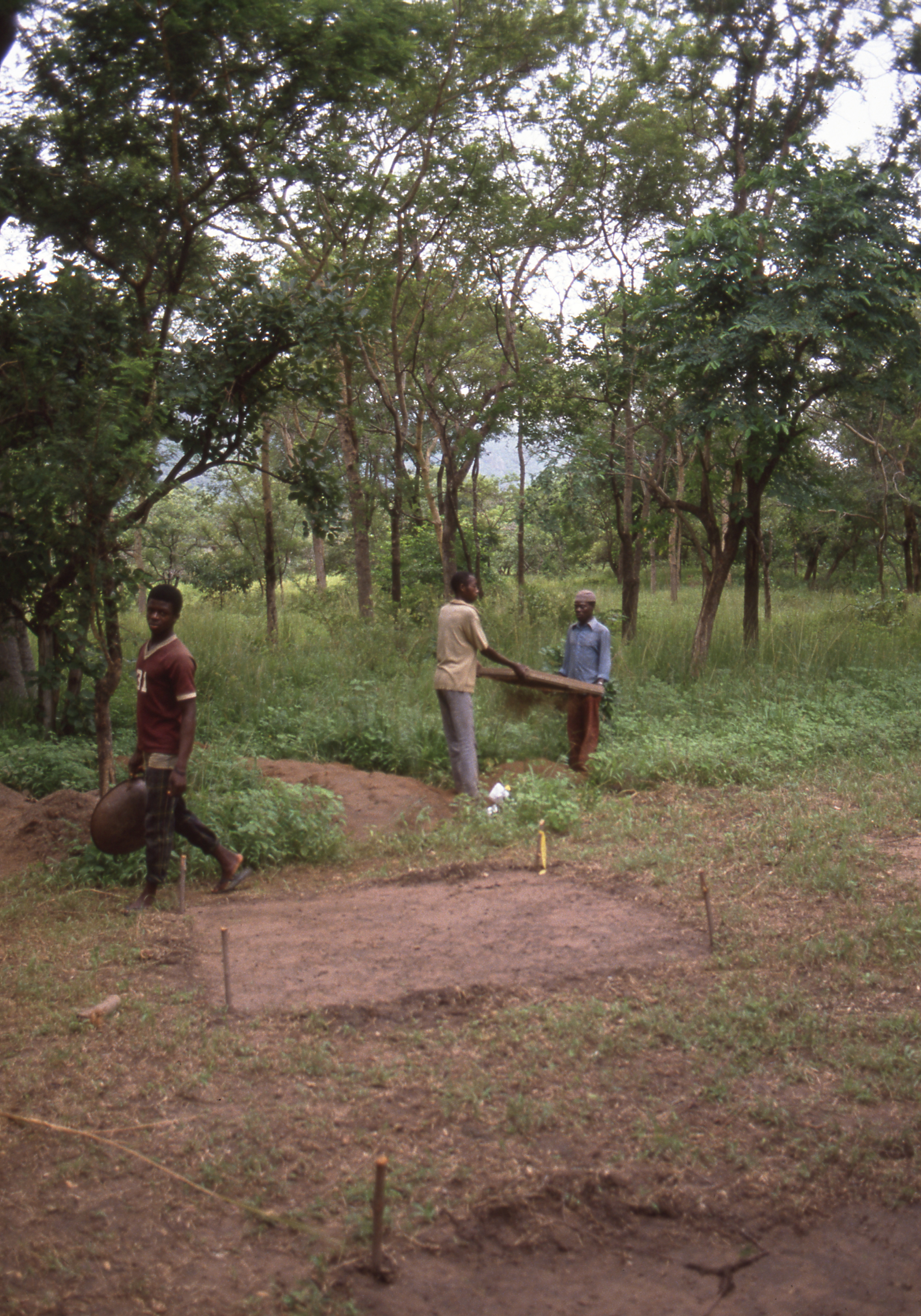Public DepositedWooden grid pegs mark the edges of a 2 x 2 m excavation unit (foreground) as two Banda Research Project team members screen soil (right) at Station 6. Osei Kofi carries an empty head pan (left). After sieving the soil, the men carefully pick and bag artifacts (fragments of pottery, metals, beads, animal bone) left in the screen. Studying these artifacts and the contexts from which they were recovered (their provenience) helps archaeologists to learn about the daily lives of past people. Makala Kataa, 1989.