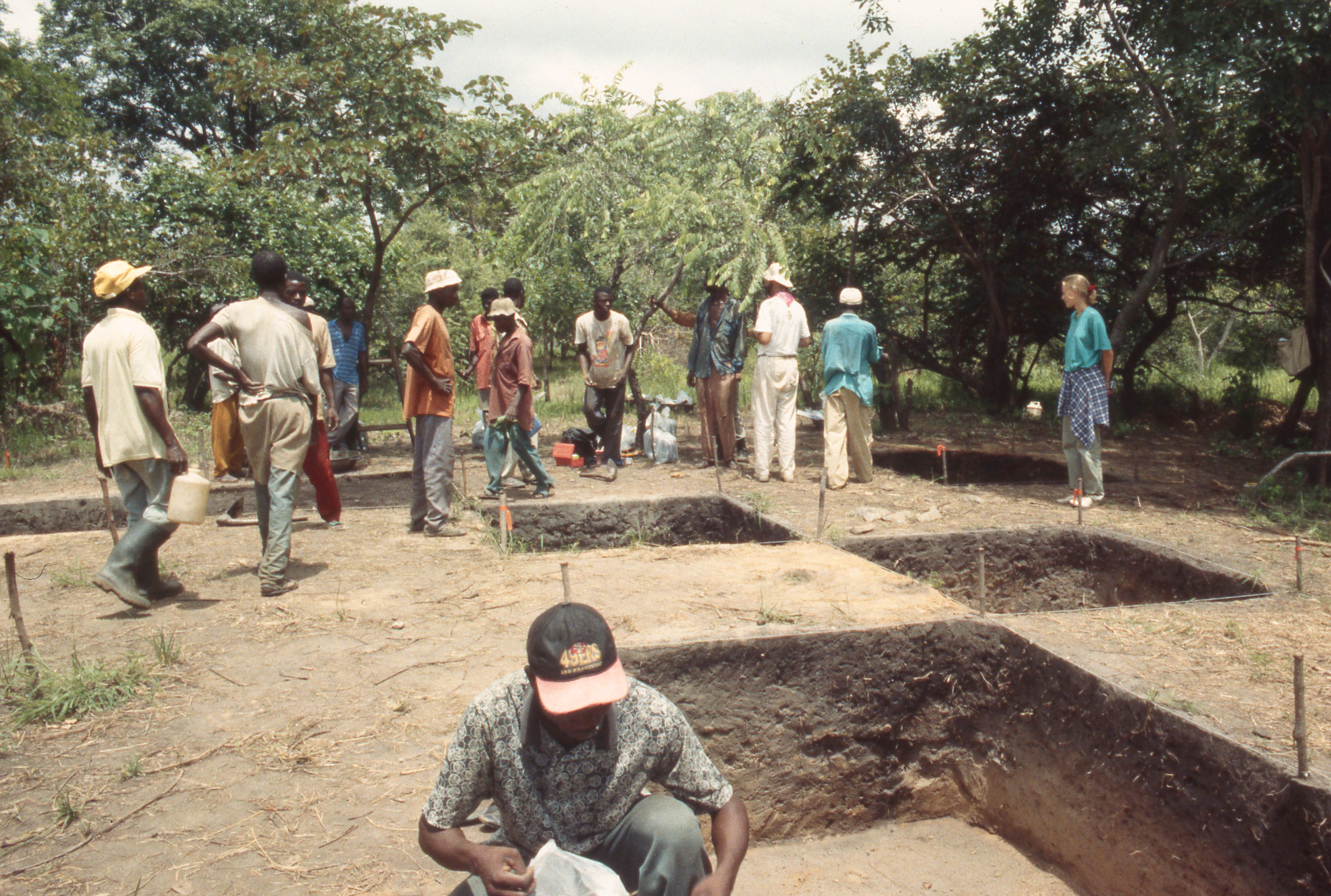 Banda Research Project excavation team members at work on Mound 118 at Kuulo Kataa. Wooden stakes mark the corners of 2x2 meter excavation units, several of which are in progress. North American students Leith Smith (white hat and shirt) and Alex Caton (far right) are pictured along with men from Dompofie and Ahenkro. View looking northward. Kuulo Kataa, 1995.