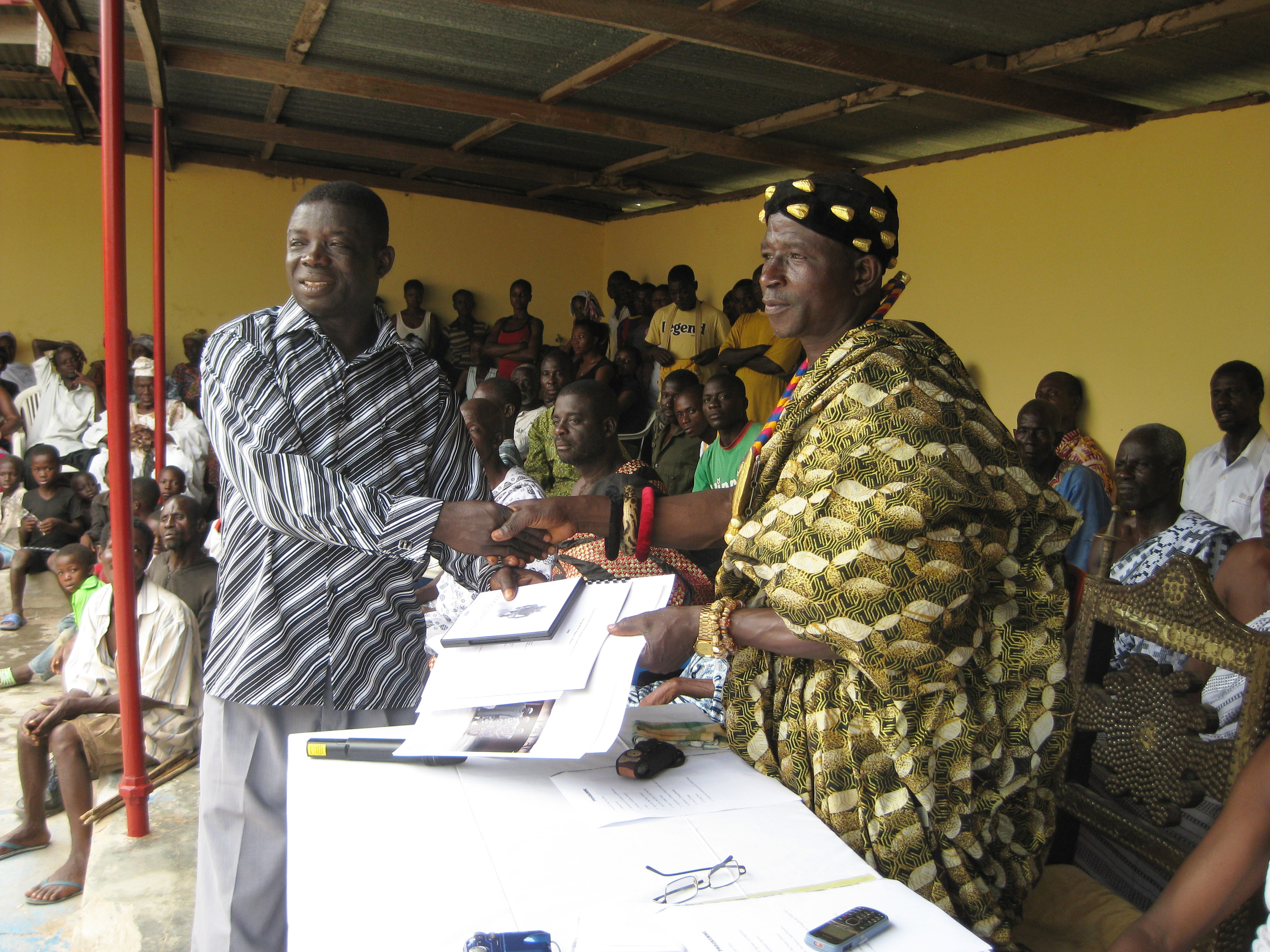 Public DepositedBanda Research Project team member Sampson Attah (left) presents a Banda chief (right) with copies of heritage documents at a community event celebrating Banda cultural heritage. Banda Cultural Centre, Ahenkro, 15 July, 2011.