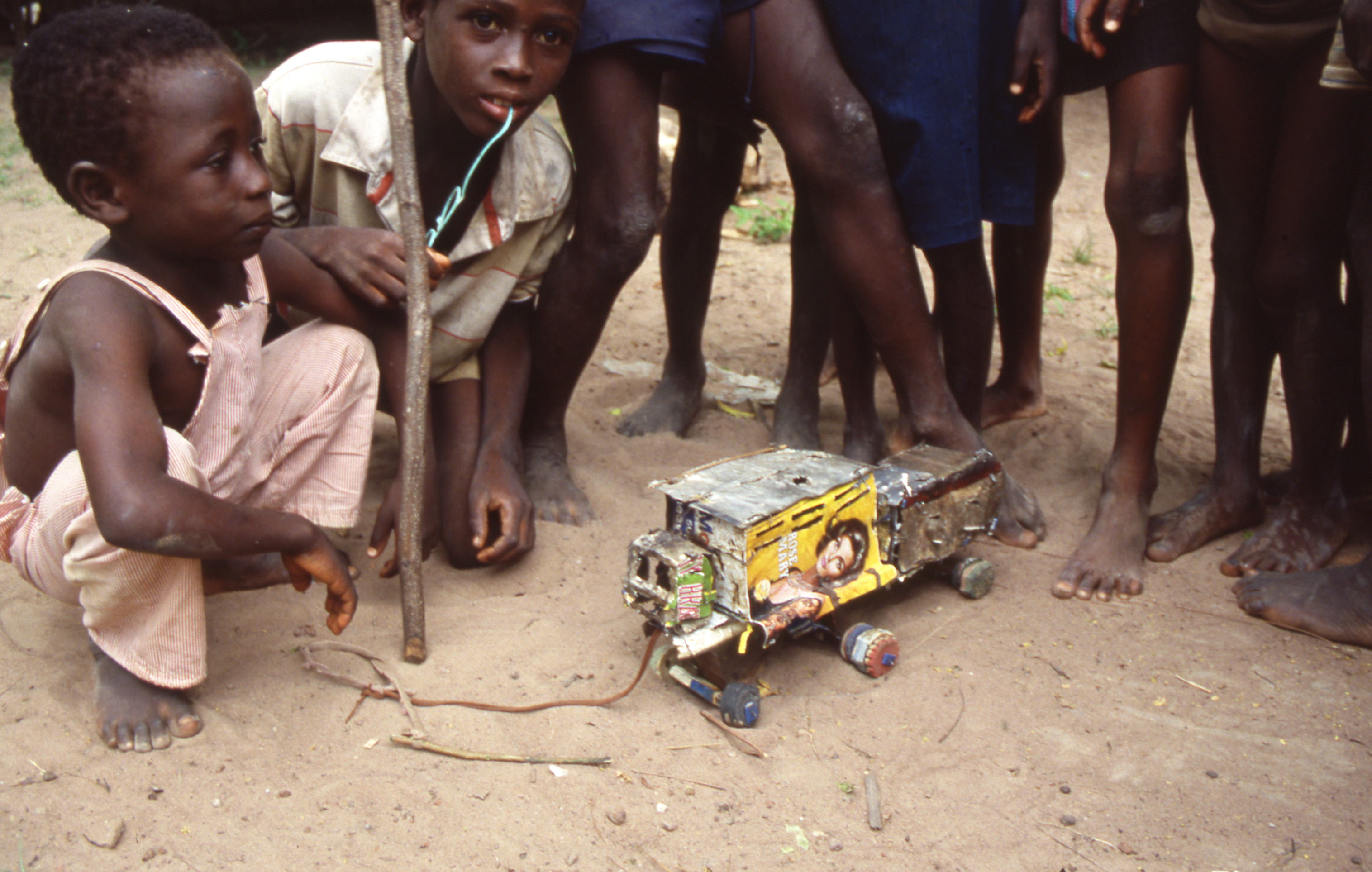 PublicA young boy has made a lorry (truck) from tin cans and other discarded materials. The wheels are made from worn-out "flip-flop" shoes and the string tied to the front allows him to pull the truck. Ahenkro, 1990.