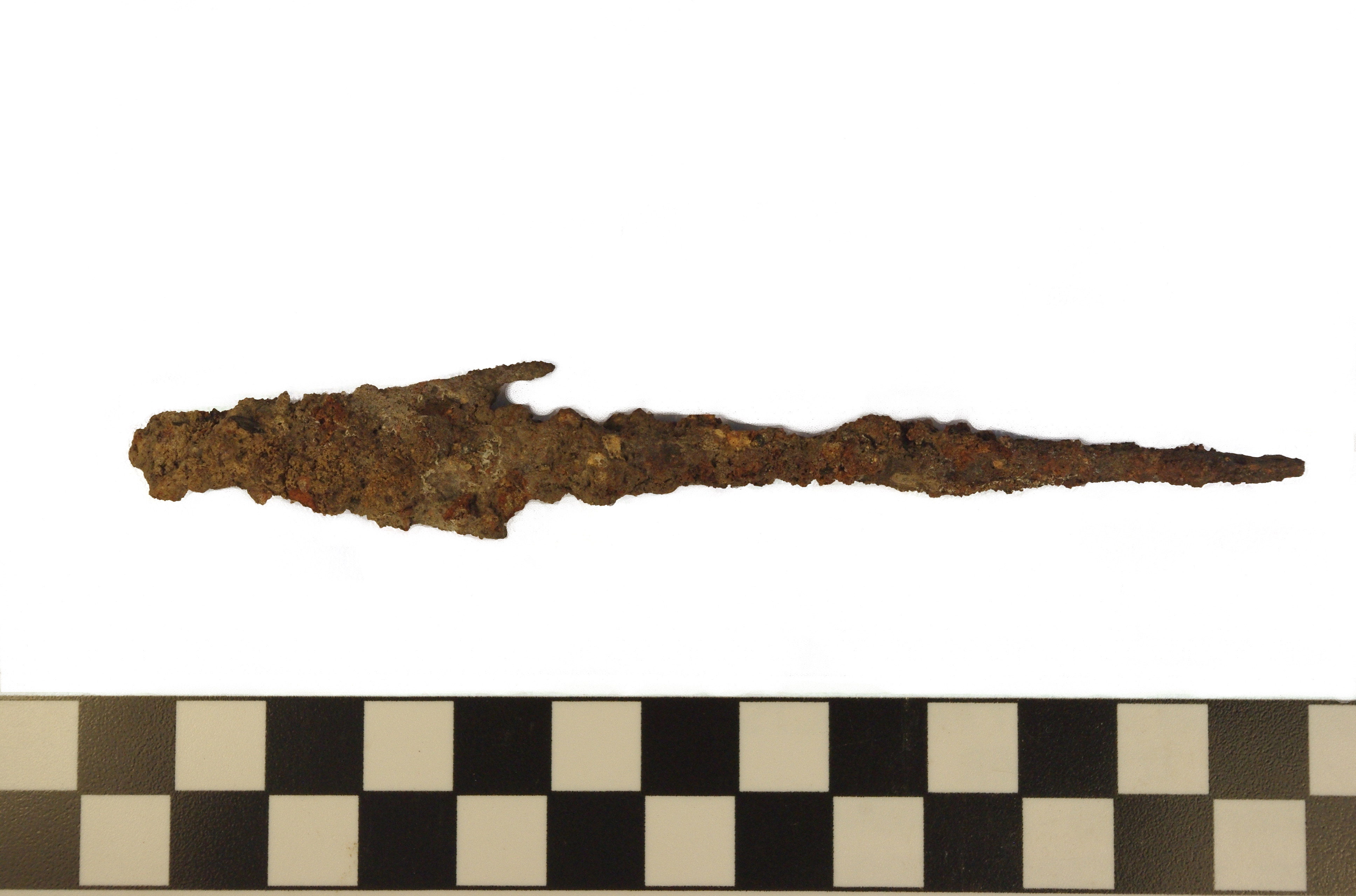 Public DepositedTriangular-headed iron projectile point with a single barb. Corroded. From Ngre Kataa, Mound 8, Unit 8N 127E, Level 12. Scale in cm. Length: 12.4 cm. Weight: 14.2 g. Ngre Kataa, 25 June, 2008.