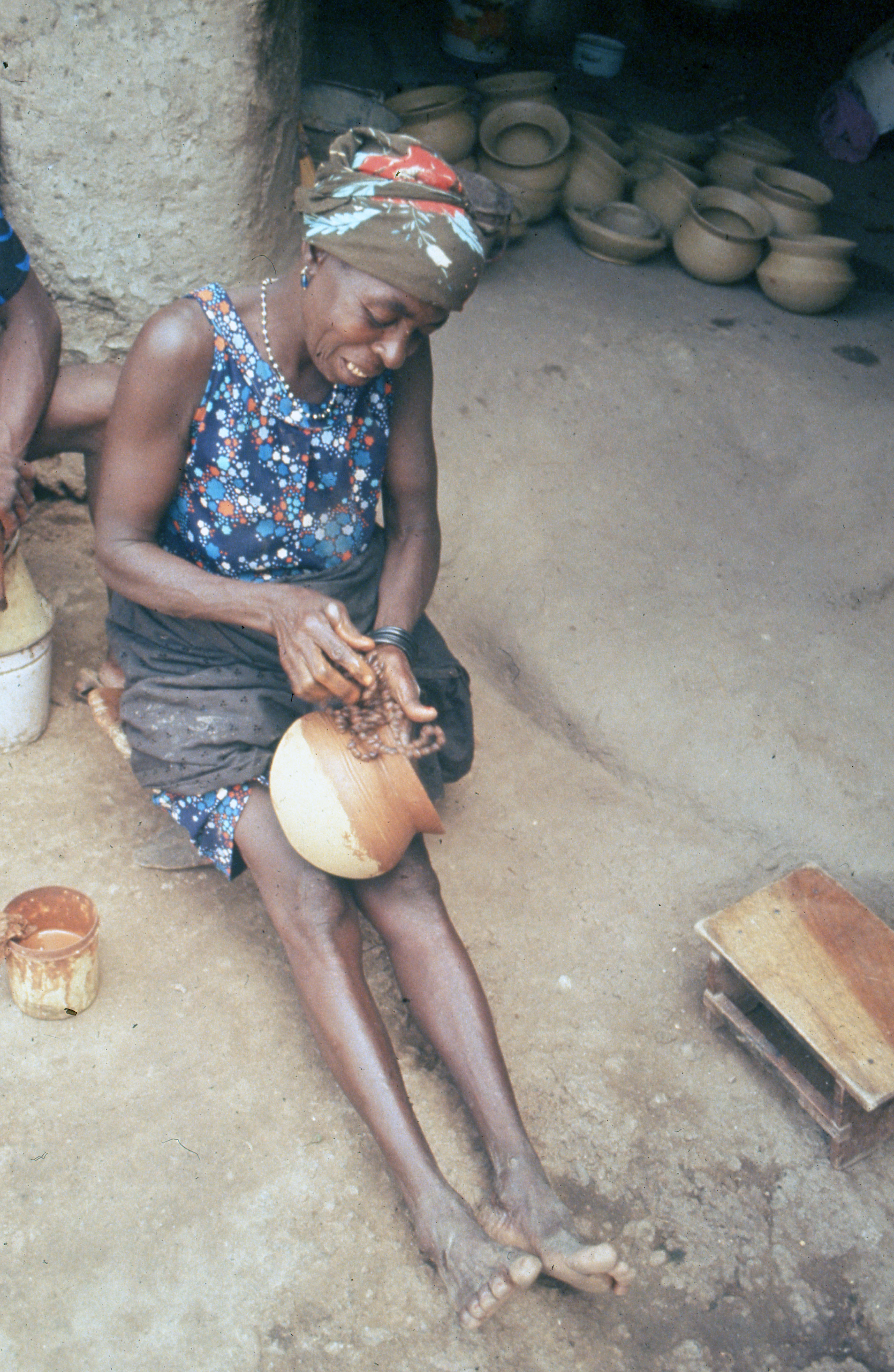 PublicAfua Donkor, a Nafana potter burnishes a dried but as-yet unfired clay pot on which she has applied a red slip (chuma in Nafaanra). She uses a strand of Baobab tree seeds (wasawasa in Nafaanra) to rub the slip, helping the color to adhere to the pot's surface and giving it a sheen. The slip is a thin solution made by mixing a red soil found on the Brawhani road with water. Some is contained in a small can sitting on the ground (left). Finished, unfired pots sit in the room behind the potter. Dorbour, 1994.