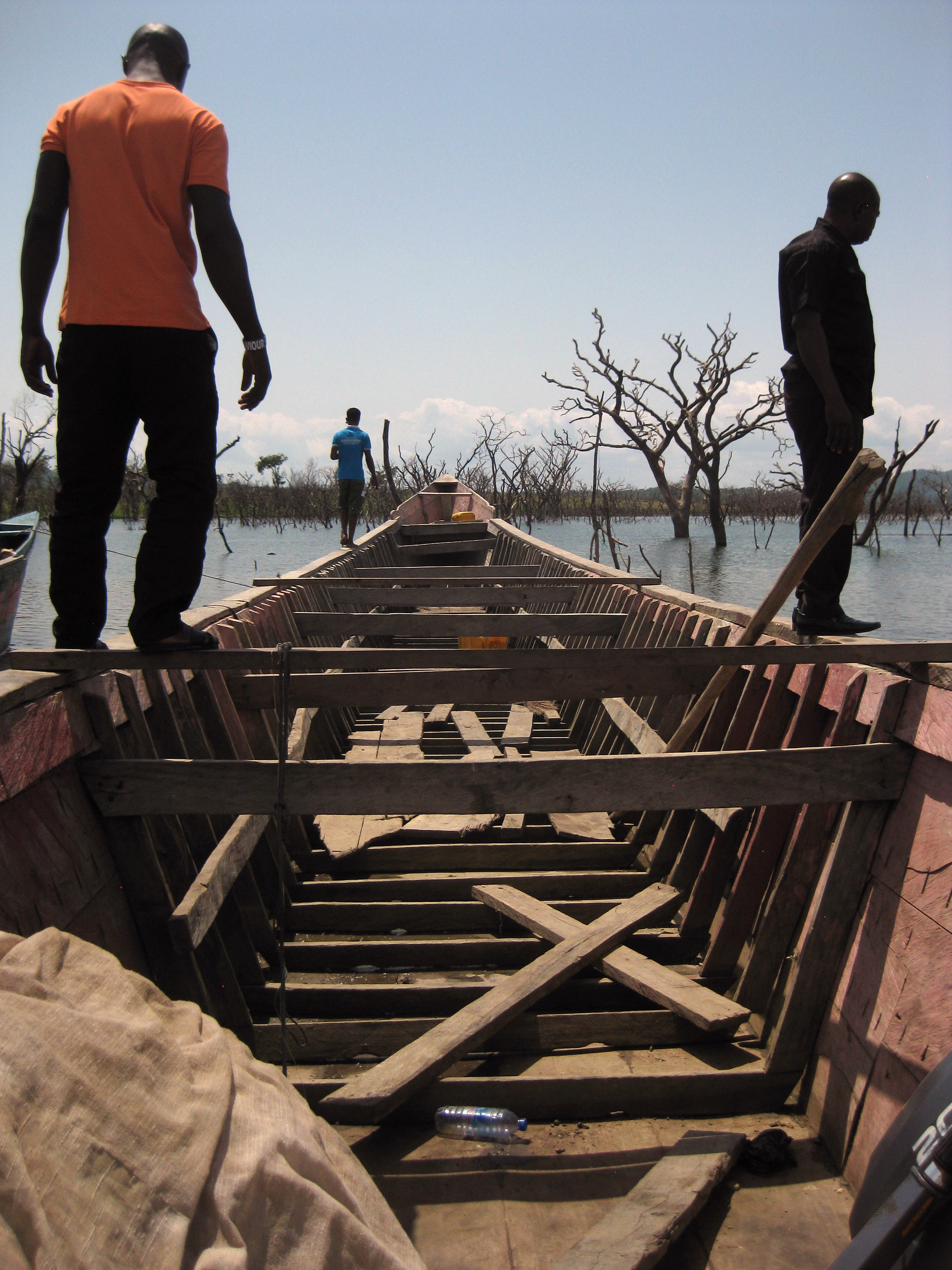 PublicAn outboard motor-powered fishing boat used by commercial fisherman on the newly formed Bui Lake. The Ewe families who fished the waters of the Black Volta River in this area before Bui Dam was built fished from small canoes. Those small boats are unsafe on the lake formed by Bui Dam because of the lake's unpredictable winds and waves. Fishing on the lake therefore requires access to capital that many local fishermen lack. Trees inundated by the rising lake waters are visible in the background. Two photos. Bui Lake, near Bongase, June, 2016.