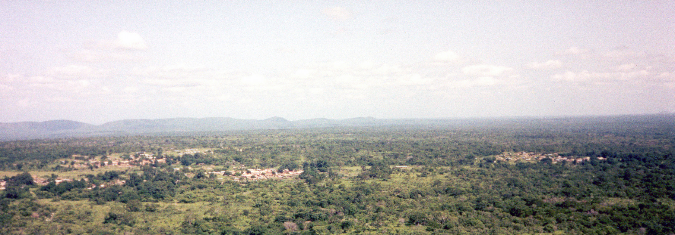 PublicView to the southeast, standing on the small hill west of Kabruno. The mountains in the distance are the range near Boase. Several villages appear in the foreground. Left to right is Gbao, Dompofie and (far right) Samwa. Banda area, 2000.