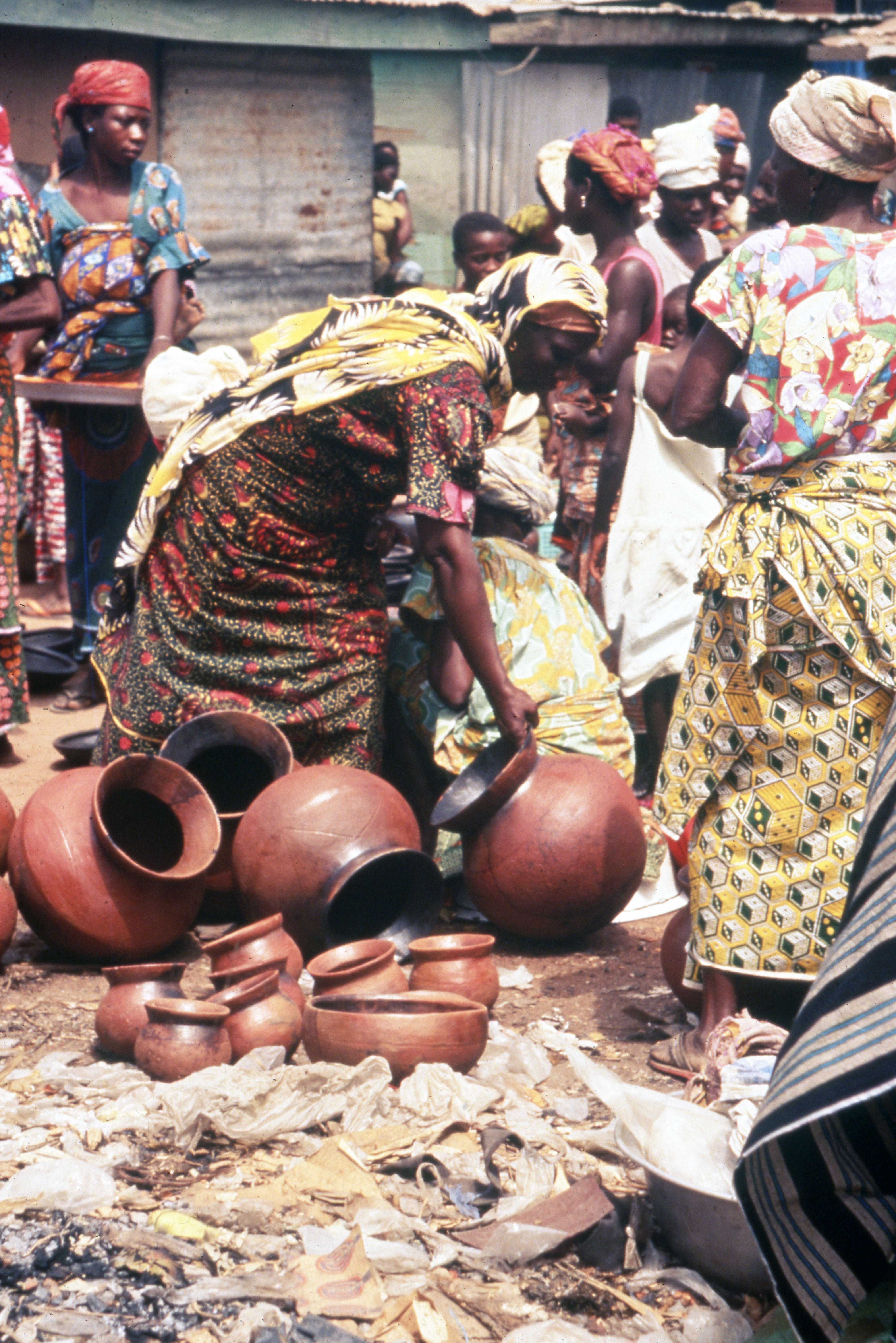 PublicA woman inspects a clay jar for sale in the Bondoukou market. Large and small cooking pots (sro chͻ in Nafaanra) and a bowl are displayed for sale. During the 20th century women from Banda potting villages and surrounding areas headloaded their pottery to sell at Bondoukou's weekly market. Bondoukou, Côte d’Ivoire, 1994.