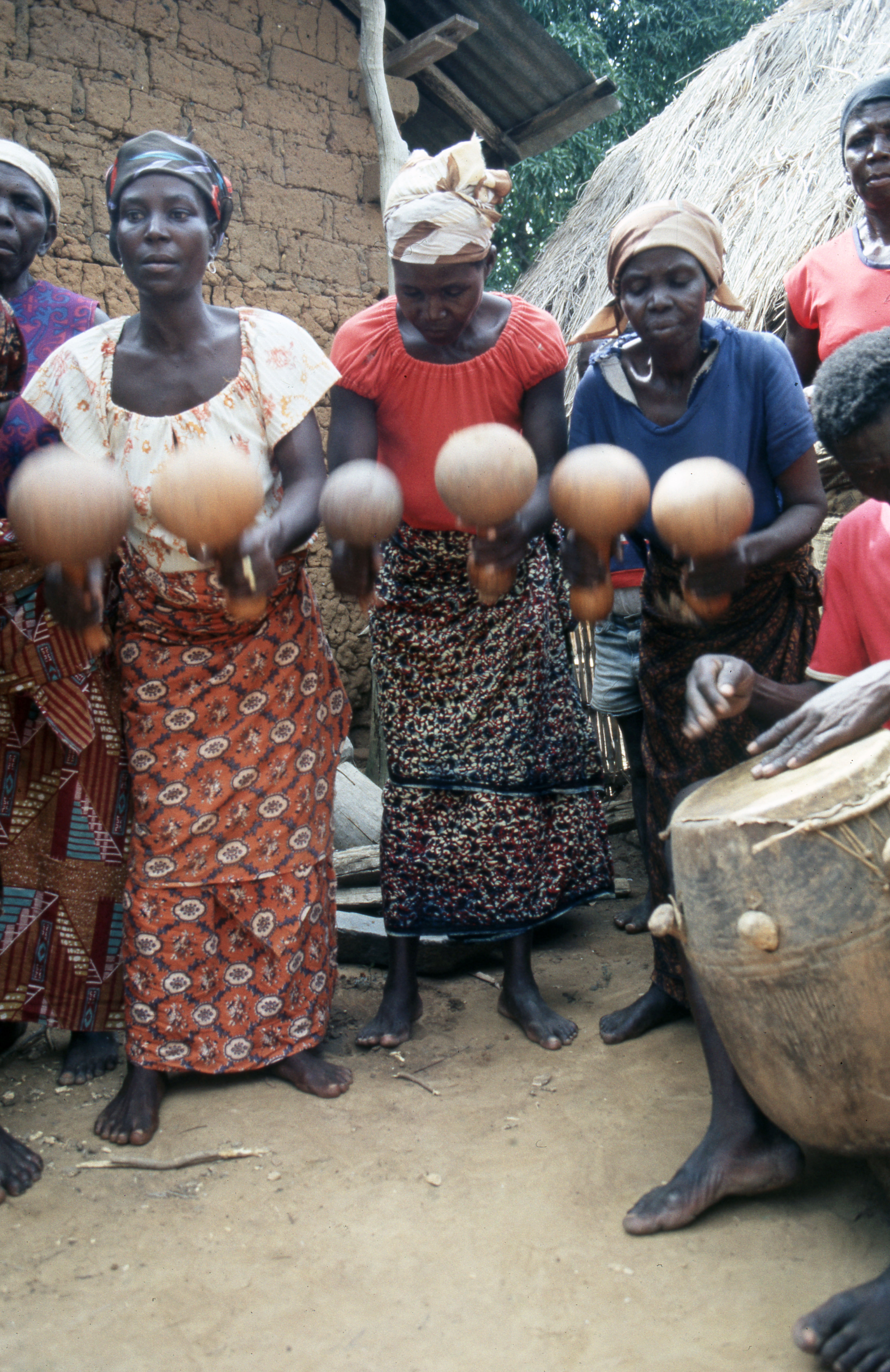 PublicGbԑԑnlԑԑ Katoo in Gbao celebrates the funeral of the caretaker of a shrine who was understood to have been killed by the 'fetish' because of harm he allegedly planned against family members. In this case, the funeral involves special forms of drumming, dancing and songs as part of a thanksgiving to the shrine. Here, (L-R) Abena Gyakari, Akua Bedu and Akua Asԑmpasa play calabash rattles as a young man to the right plays an apentemma (Twi) drum. Three photos. Gbao, 8 August, 1986.