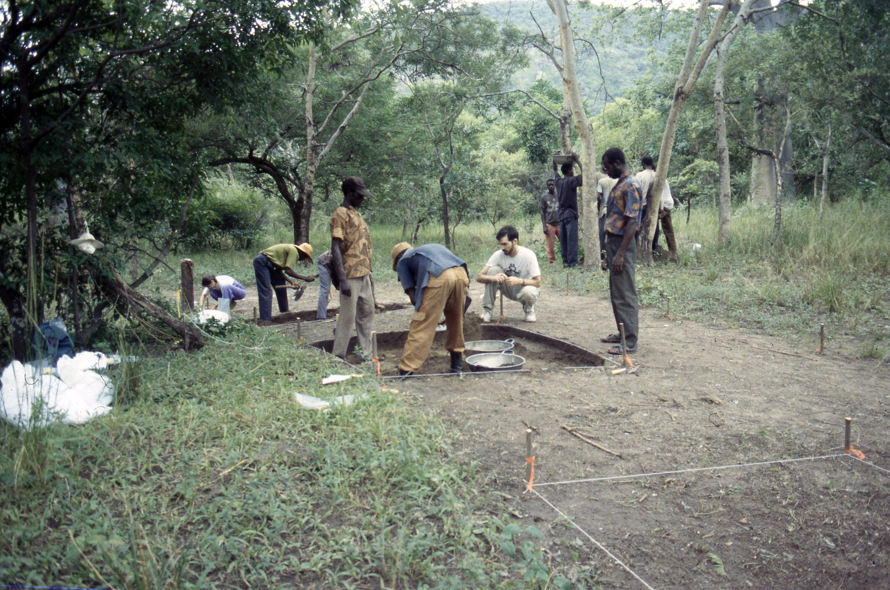 Public DepositedBanda Research Project team members excavate units at Mound 6, Station 6, Makala Kataa. Alex Ababio (standing left, in hat) watches as Kwasi Peter digs with a short handled hoe, placing excavated dirt into headpans. Leith Smith (center) and Yaw Francis (right) look on. In the background (right) other team members screen soil. Wooden stakes mark 2 m interval grid points with excavation units marked off by string. A large baobab, one of several on the site, is visible in the background (right). Makala Kataa, June 1994.