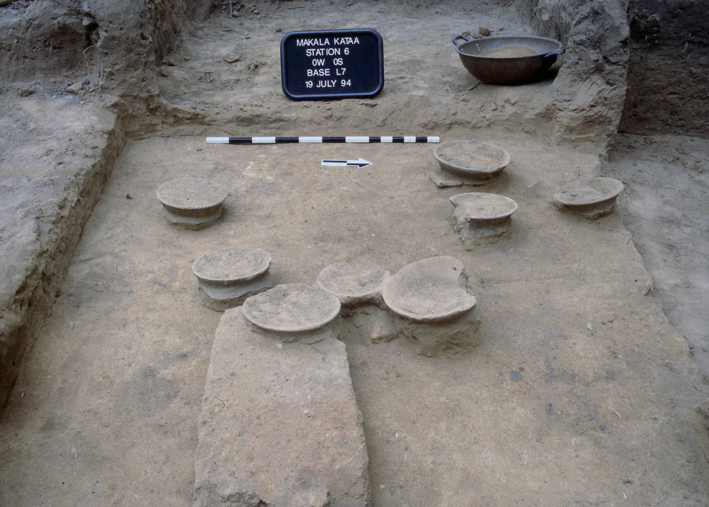 Eight jar rims have been exposed in situ at the base of level 7, unit 0W 0S, Mound 5, Makala Kataa Station 6. The jar rims are broken off below the neck of the pot and appear to have been placed around a room where they were used as pot stands. In a raised area (bottom center), not excavated to the same depth as surrounding soil, a concentration of reddish soil and gravel marks the traces of a house wall. Archaeologists interpret unit 0W 0S as a part of a kitchen area where foodstuffs were likely stored. The pots and their contents have been removed, with only the pot stands remaining. In the background sits a headpan filled with soil from cleaning the 2 x 2 m unit prior to photoing. A scale arrow with 10 cm intervals points north. View to the west. Makala Kataa, 19 July, 1994.