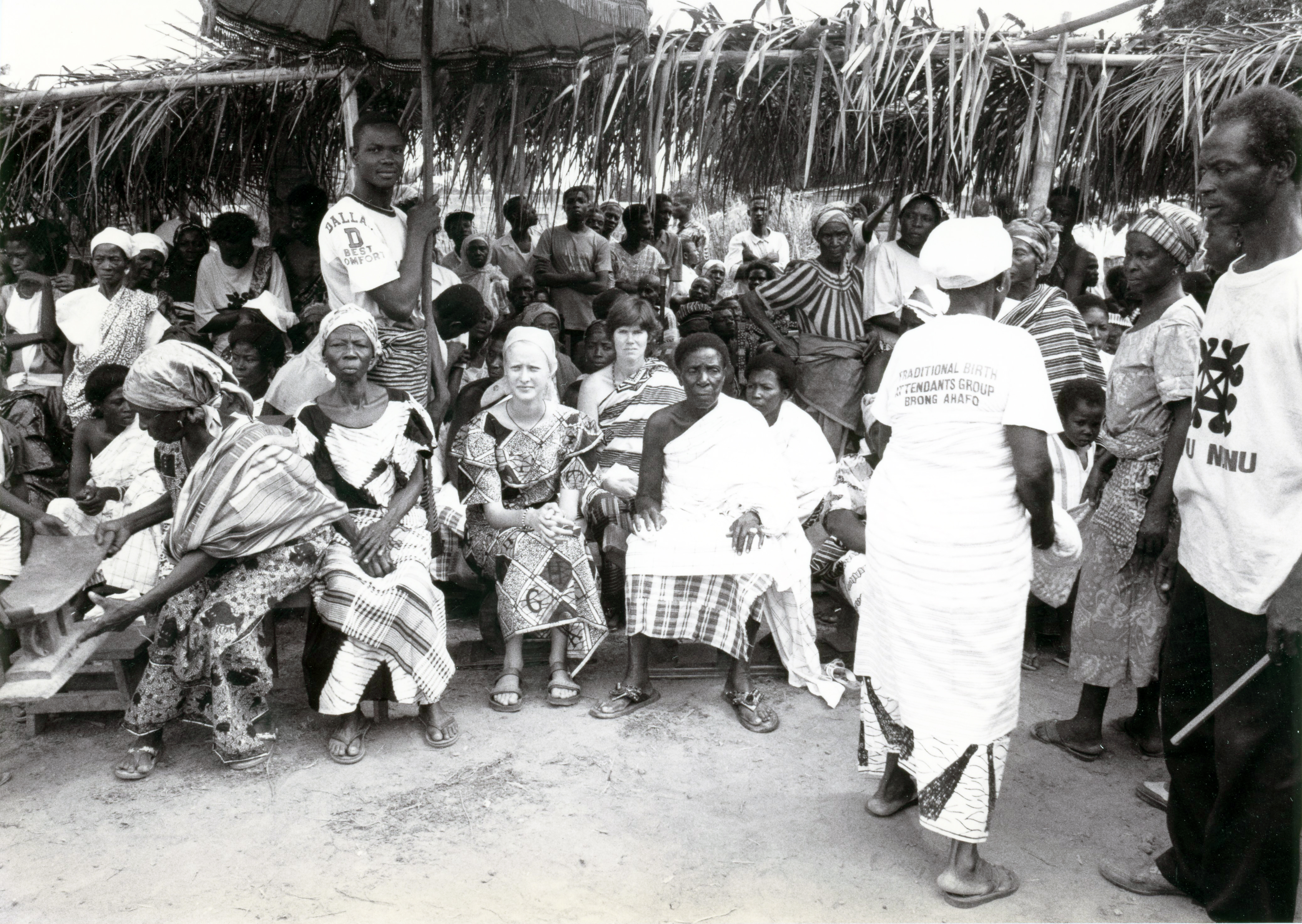 Public DepositedFemale elders are seated under a thatch awning outside the Banda Cultural Centre on the day of its commissioning, Ann B. Stahl (seated center) has just been enstooled as an honorary Queen Mother of the Banda Traditional Council under the stool name Yadwo Gongo II. To the left is Binghamton University graduate student Alex Caton (Peni Yaa) and seated to the right wearing white cloth is Afua Wewa, one of the Banda Queen Mothers elders. A young man holds an umbrella over the Banda Queen Mother, Lelɛɛ Akosua Kepefu, who sits behind Alex Caton. Ahenkro, 21 July, 1995.