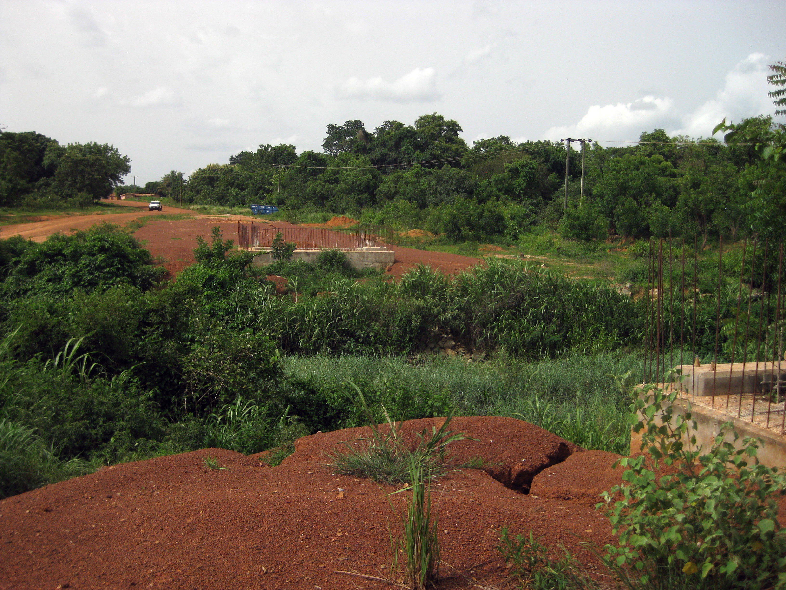PublicConstruction of a new bridge to replace a long-used one over the Tombԑ River near Sabiye on the road from Menji to Ahenkro began in the 2010s. Its abutments are visible here, view to the north. Construction had stalled by 2016. Sabiye, 19 June, 2016.