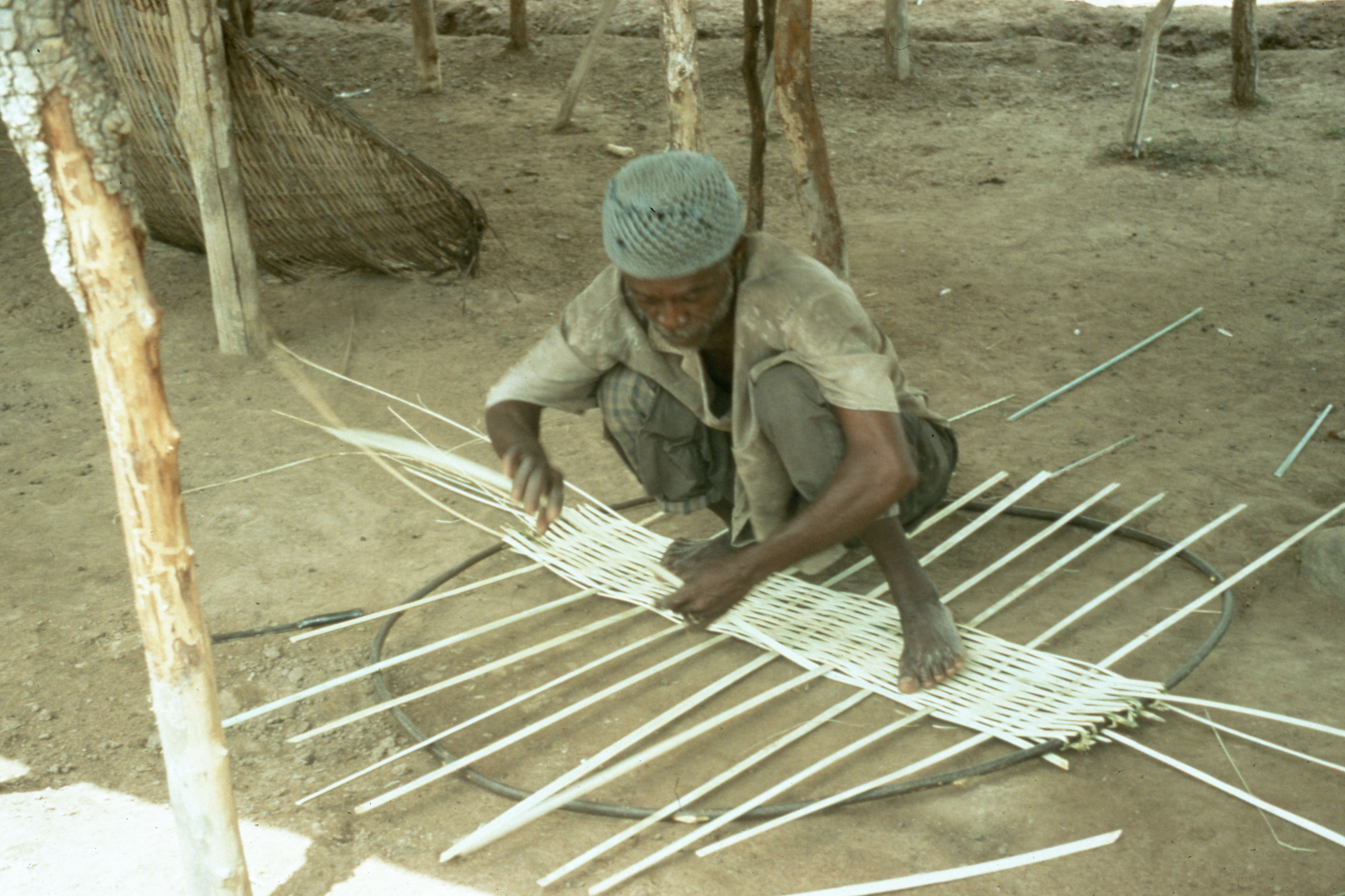 PublicA man in Dompofie makes a basketry tray (gbrewa in Nafaanra). He uses a (metal?) tube as a frame. First the warp slats are placed at intervals on the frame. Then the weft slats are interwoven with the weft, starting from the center and working outward to the edges. Trays like this could be used in crop processing or for temporarily storing foodstuffs. A finished, well-worn basketry tray is visible, upper left, leaning against a pole. Dompofie, 1995.