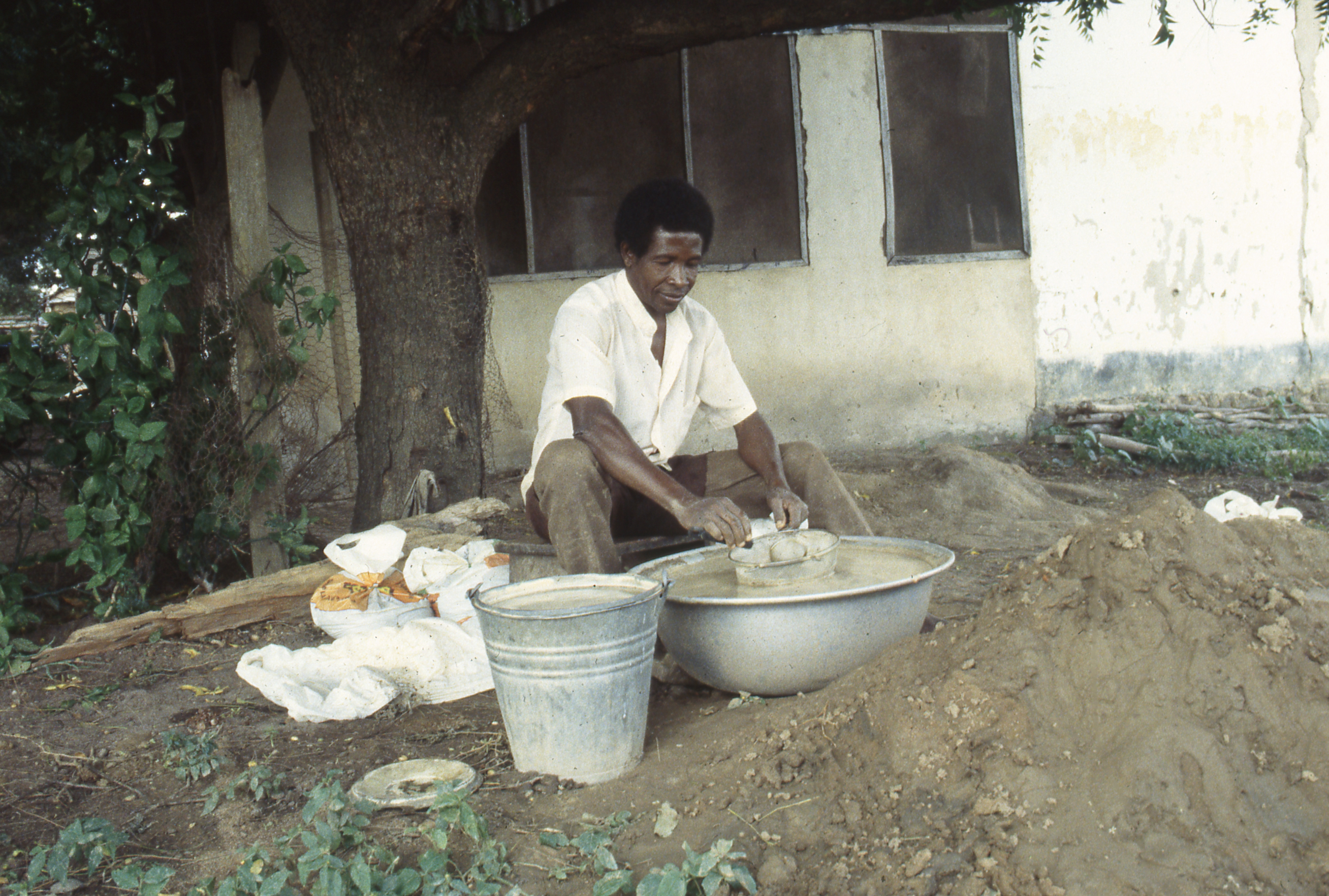 Public DepositedBanda Research Project team member Mensah Listowell processes soil samples from Makala Kataa using a bucket flotation method. The large head pan is filled with water into which he lowers a wire mesh basket filled with soil. As he gently shakes the basket, the soil dissolves and passes through the basket mesh. He uses a small mesh ladle to skim the seeds and charcoal ("light fraction") that float to the top of the water inside the basket. The "heavy fraction" which remains in the basket after the soil has washed away will be set aside to dry. It will be sorted for small artifacts like beads that may have been missed during excavation. Ahenkro, 1994.
